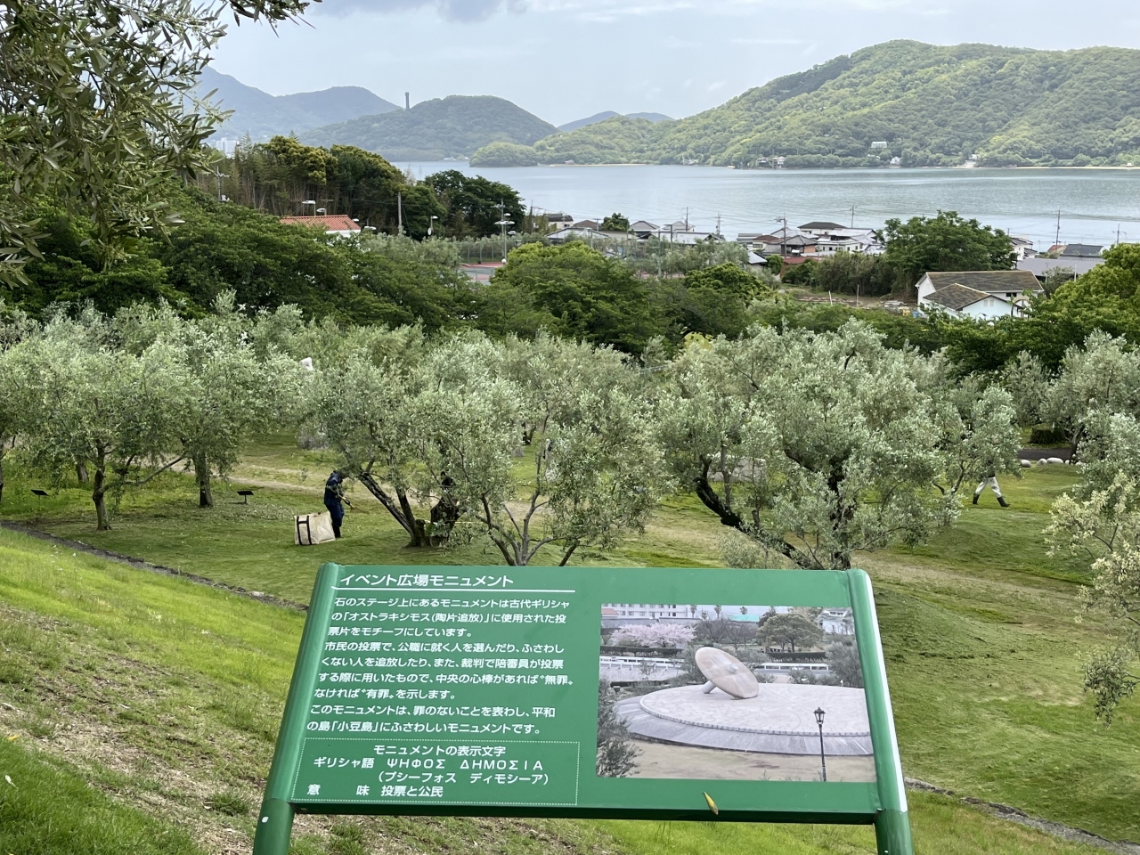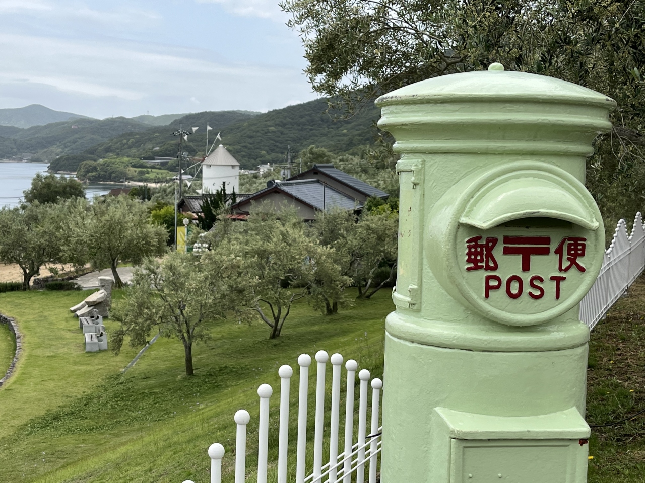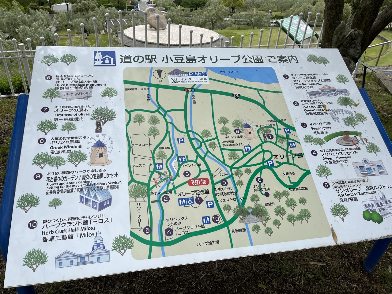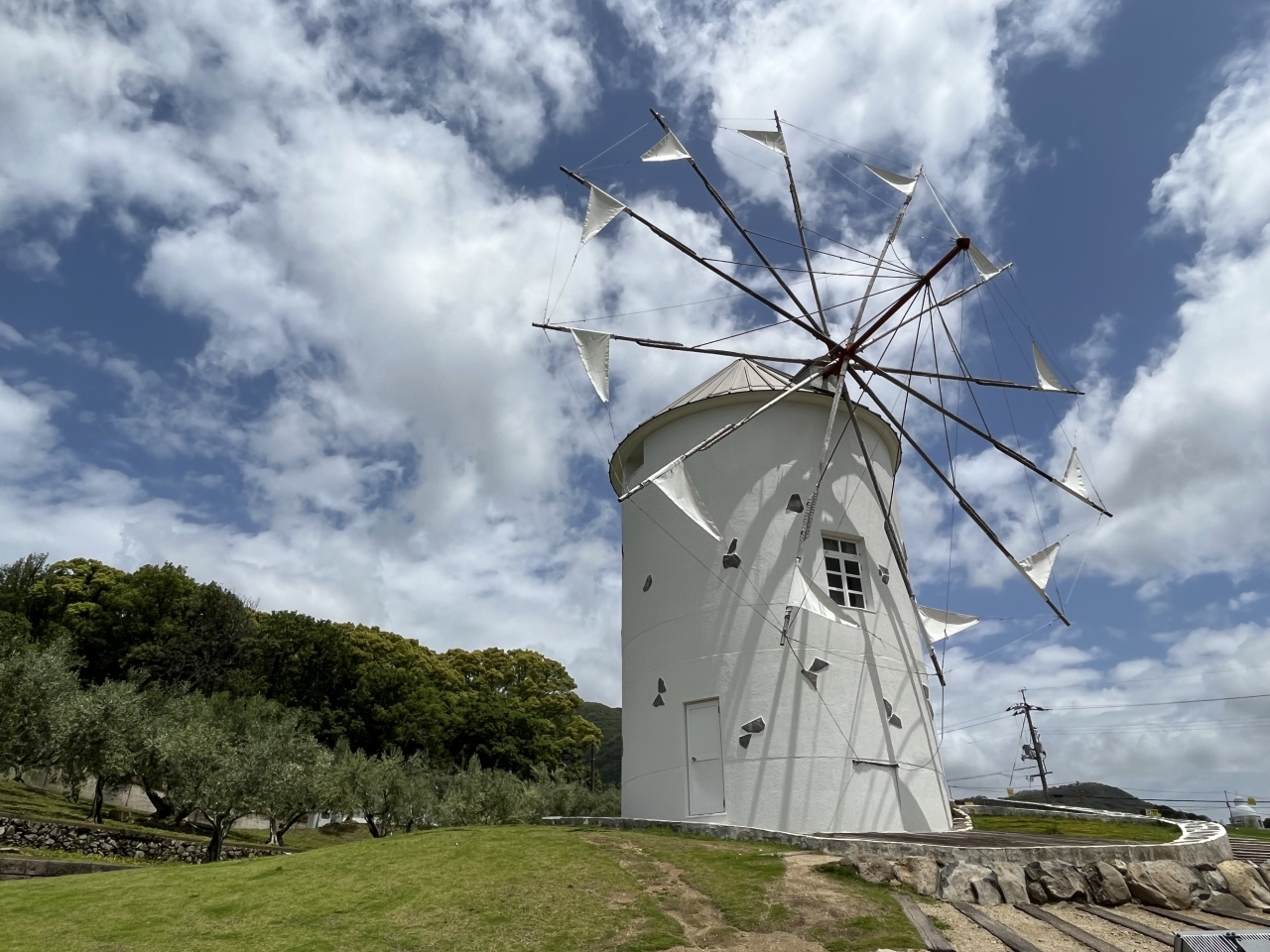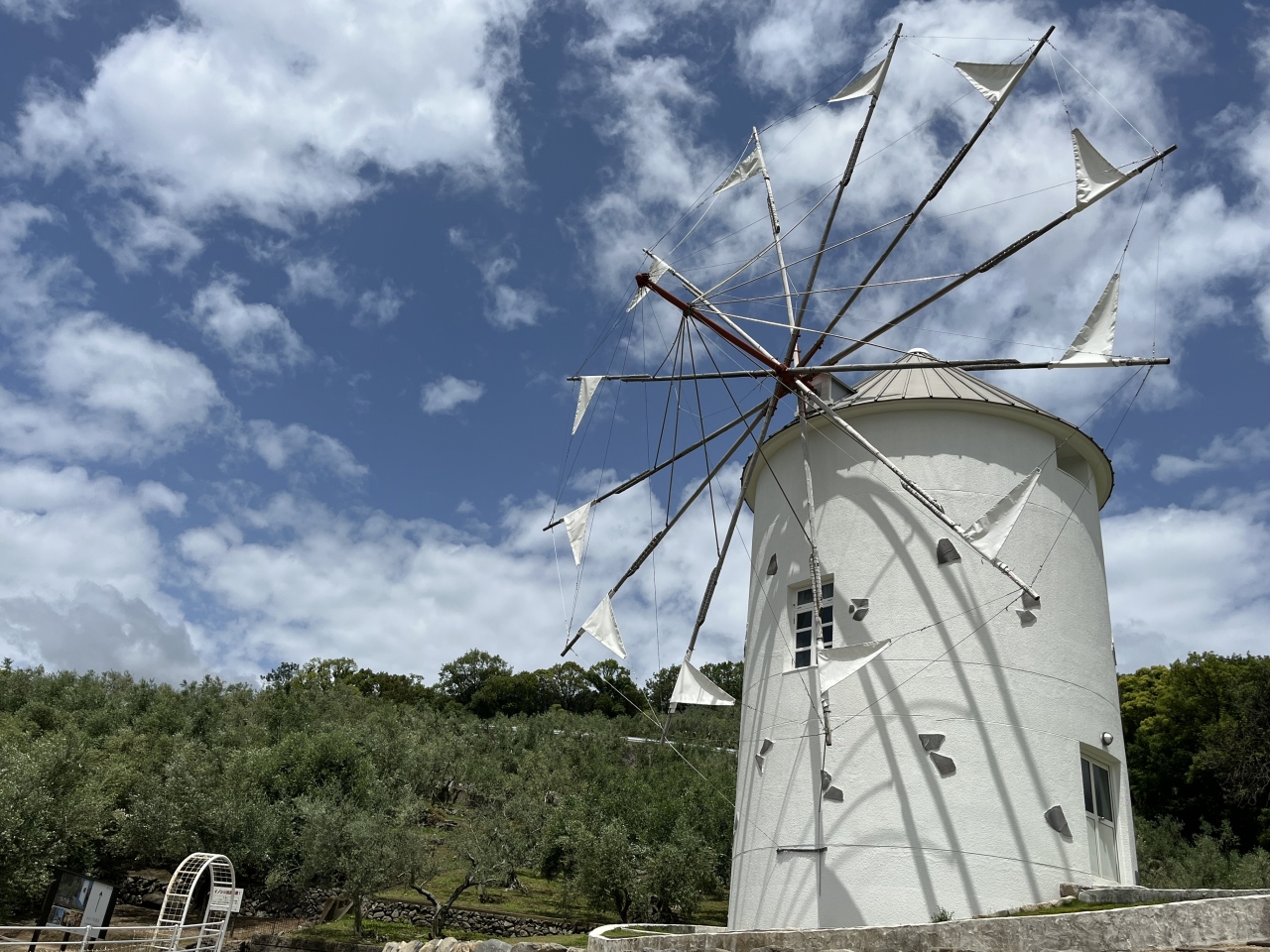 小豆島の青い海、たくさんのオリーブの木、そしてギリシャ風車など、地中海のような雰囲気が味わえる道の駅だと思いました。オリーブの木や花も初めて見たし、青空とギリシャ風車も写真映えする風景だと思います。魔女の宅急便のロケ地だったらしく、ギリシャ風車の近くでは、無料貸し出しのほうきにまたがって写真撮影をする方々が多かったです。お土産店もあり、オリーブを使ったお菓子などが売っていました。