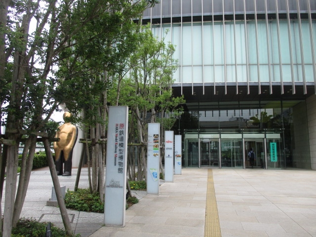 横浜駅東口からそごうデパート抜け日産自動車グローバル本社前の水際線プロムナードを進むと30階建ての超高層オフィスビルに着きます。1階にコンビニ、2階に原鉄道模型博物館が入っていて買物、食事、鉄道模型の見学を楽しめました。鉄道マニア必見です。正面にある金色の人型のオブジェが気になります。帷子川沿い水際線プロムナードは浜風が気持ち良かったです。