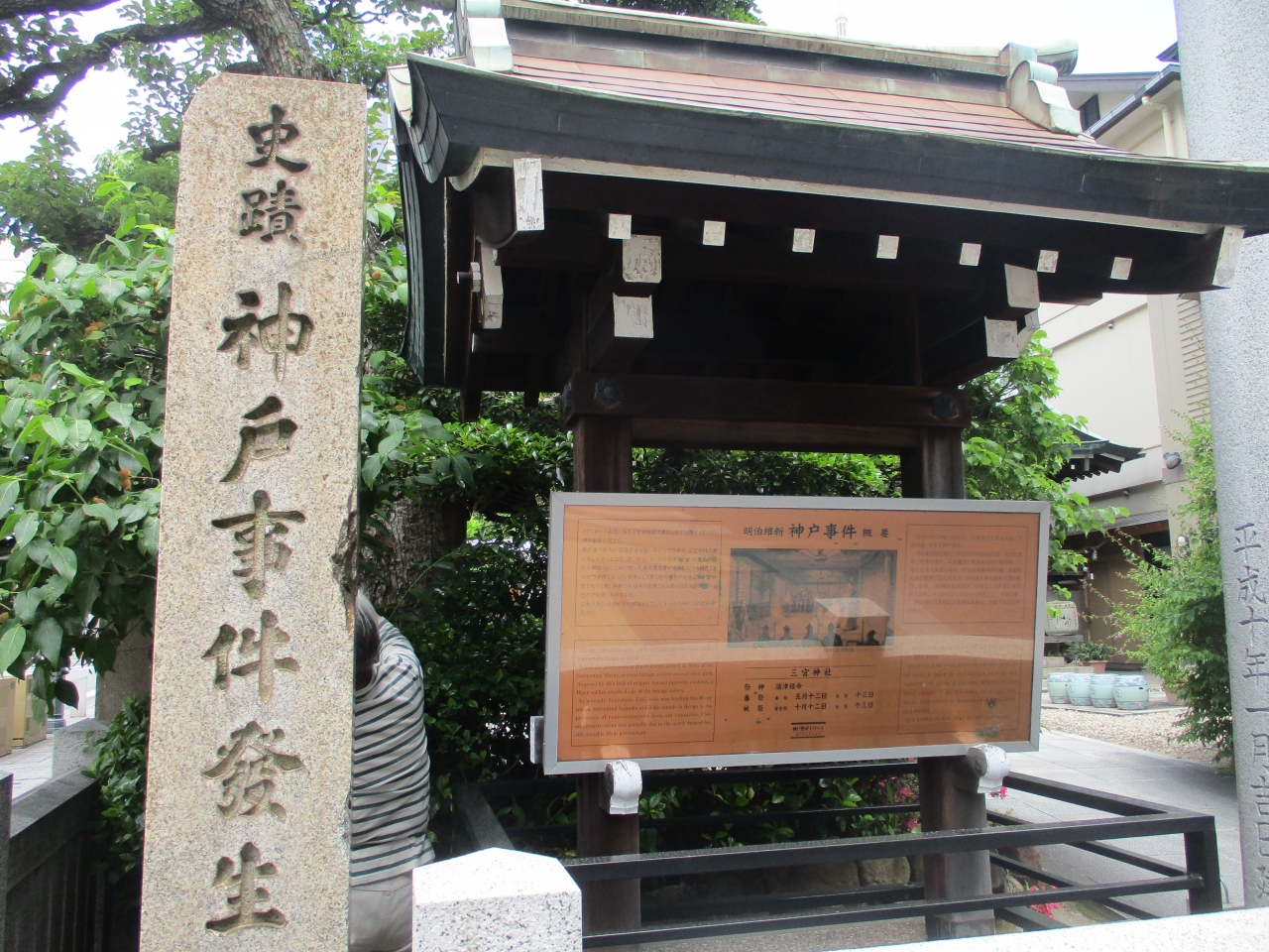 大丸神戸店の近くに三宮神社があります。境内が小さい神社ですが存在感があります。「史跡 神戸事件発祥の地」碑(大きくて目立っています)と説明板、大砲も置かれています。