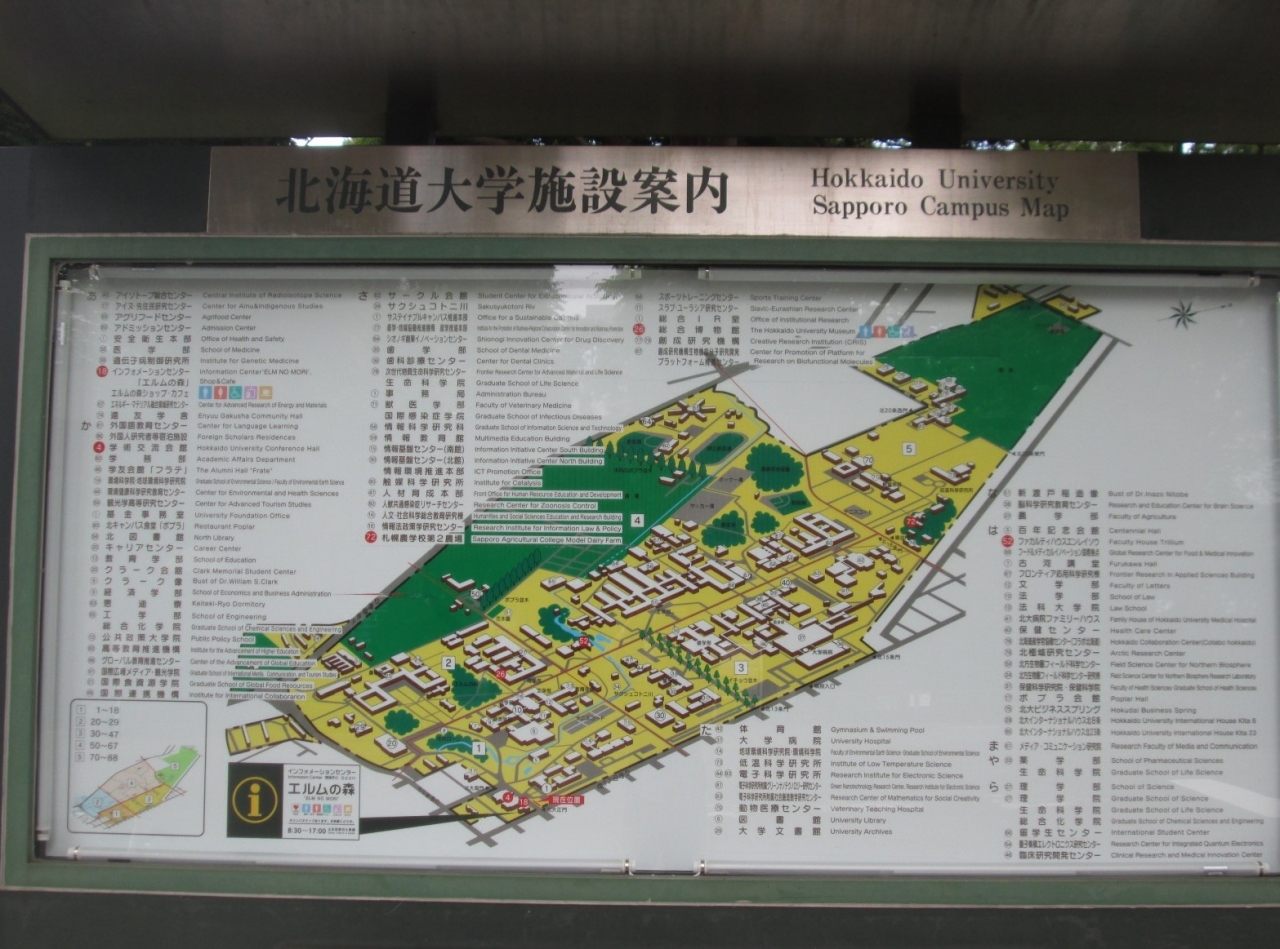 札幌駅から北へ徒歩7,8分ほど、1876年に札幌農学校として設立され、クラーク博士で有名な総合大学です。