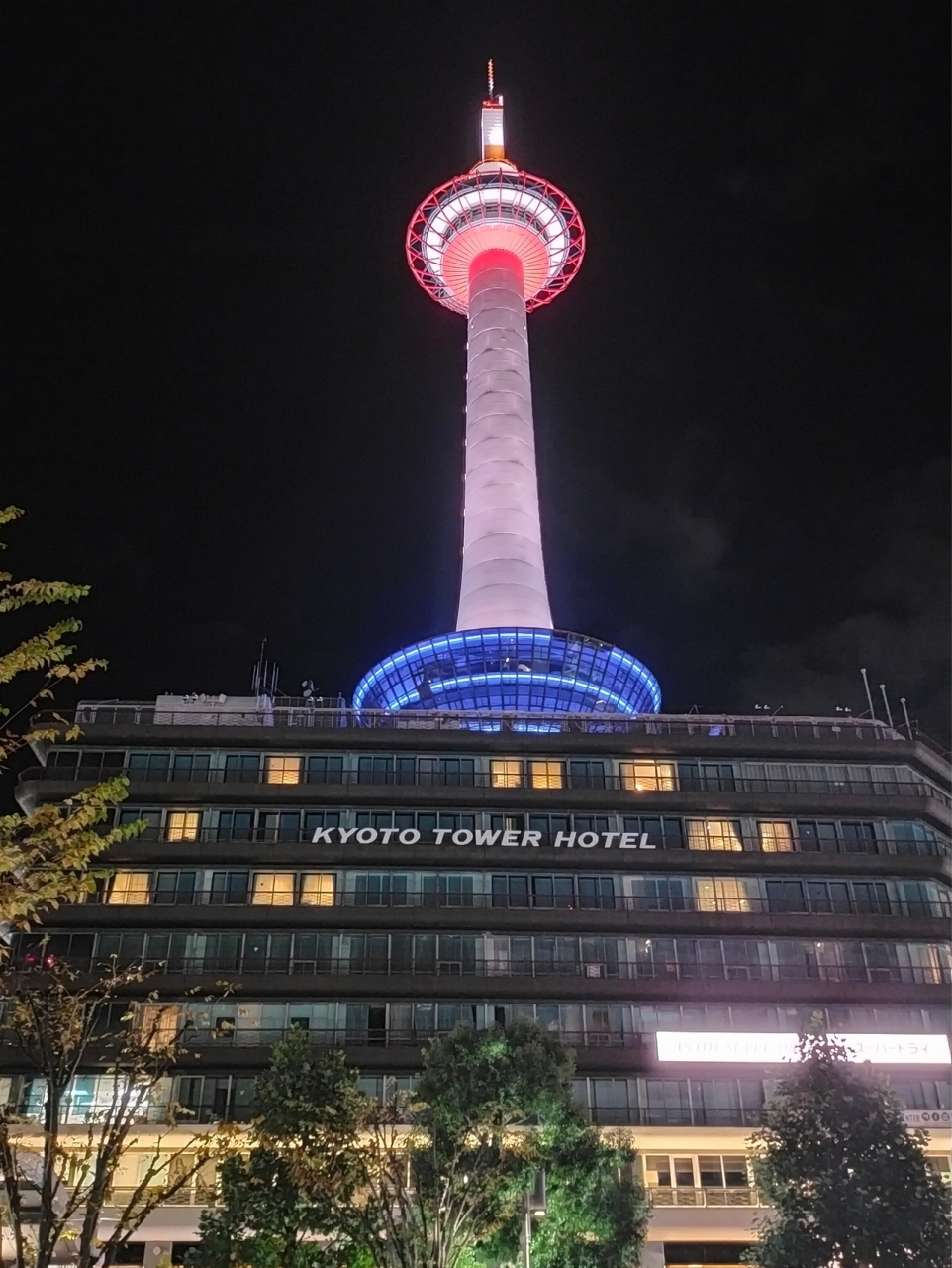 京都駅の前にある、京都のシンボルです。新幹線からも見えました。近くで見ると、けっこう高さがあって迫力がありました。夜はタワーがライトアップされてきれいでした。今回はタワーに上る時間がなかったので、時間はトライしたいです。