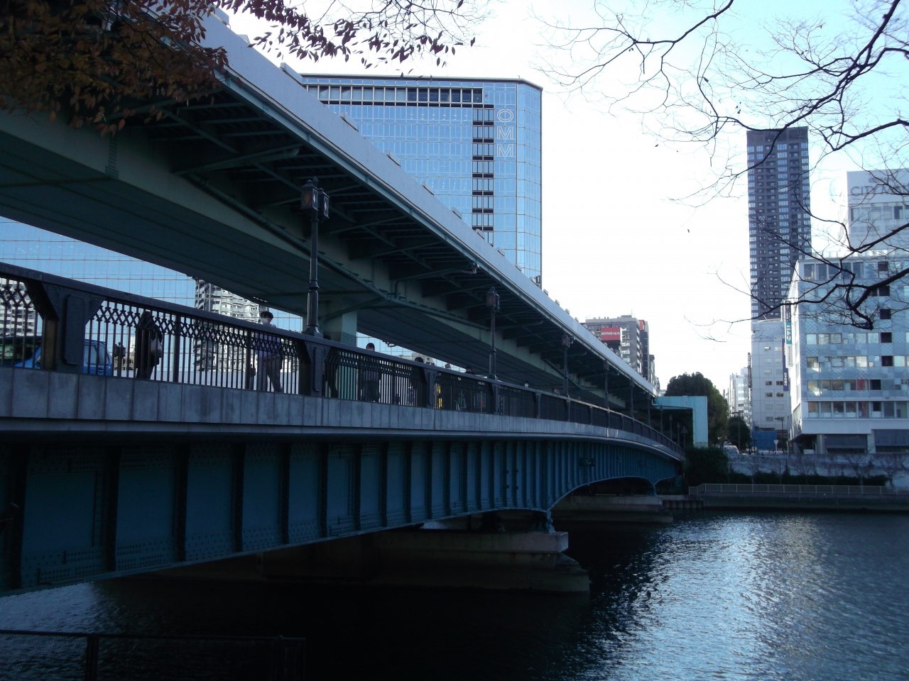 地下鉄・京阪電車の天満橋駅からほど近い、淀川の支流の大川に架かる長さ200メートルほどの橋です。すぐ上に車専用の橋が架かっているのが特徴です。両方向2車線ずつの幅の広い橋で交通量も多いですが、広い歩道も両側にあるので安全に渡れます。橋の欄干にある街灯は趣があり、歴史を感じさせます。