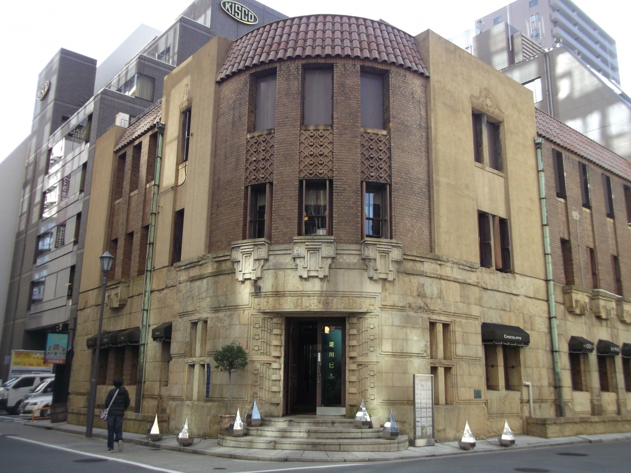 地下鉄淀屋橋駅の本町寄りの出口を出るとすぐの、心斎橋筋と伏見町通の交わる角にあるレトロ調のビルです。薄茶色と焦げ茶の石造りの建物で、丸みを帯びた入口付近とそのまわりの装飾が印象的です。昭和の初めに輸入業を営む芝川又四郎によって建てられたもので、近代的なビルが立ち並ぶ中で異彩を放っています。