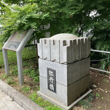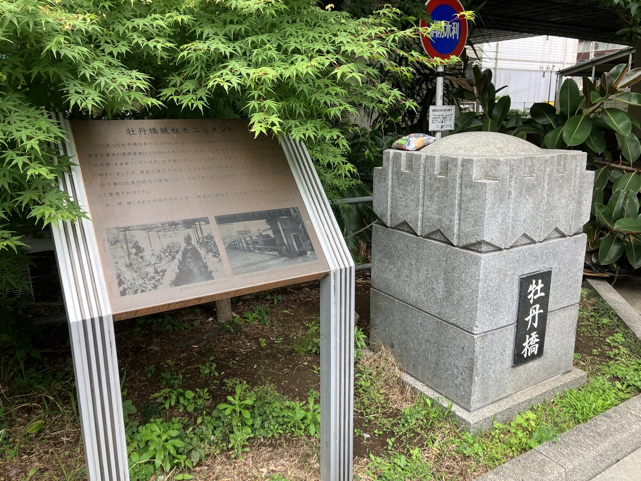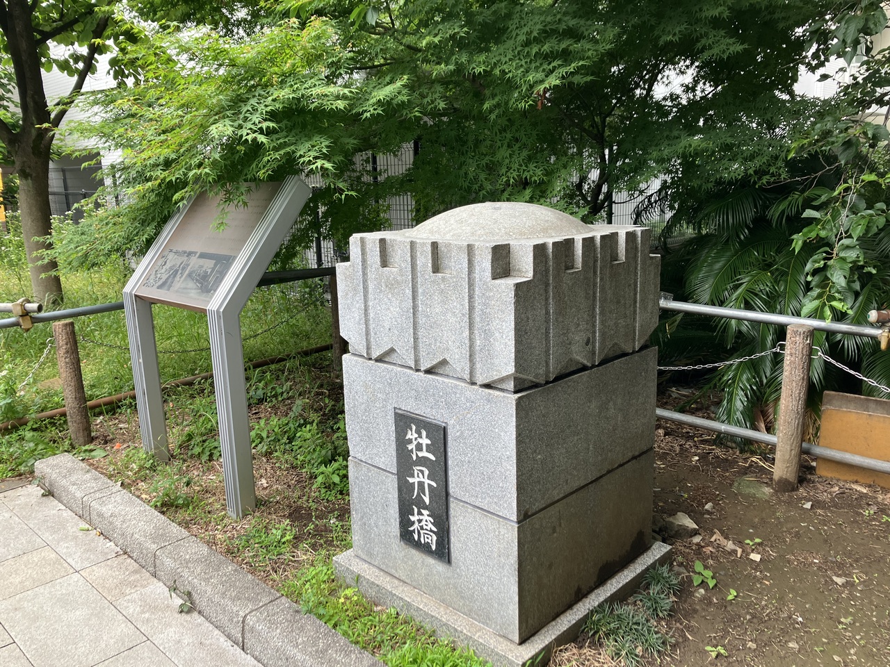 JR総武線「錦糸町駅」南口から徒歩で10分ほどです。首都高速7号線高架を越えた道路際にあります。「堅川」にかつて架かっていた橋の親柱のモニュメントです。関東大震災復興事業で架けられた35mほどの橋で近くに「牡丹園」があったことから名付けられたそうです。平成2年に橋は撤去されました。今はひっそりと名残りを惜しむのみです。