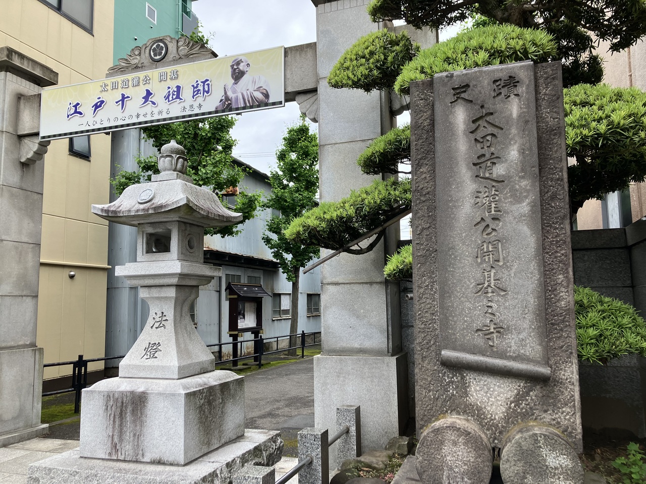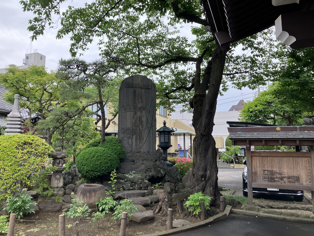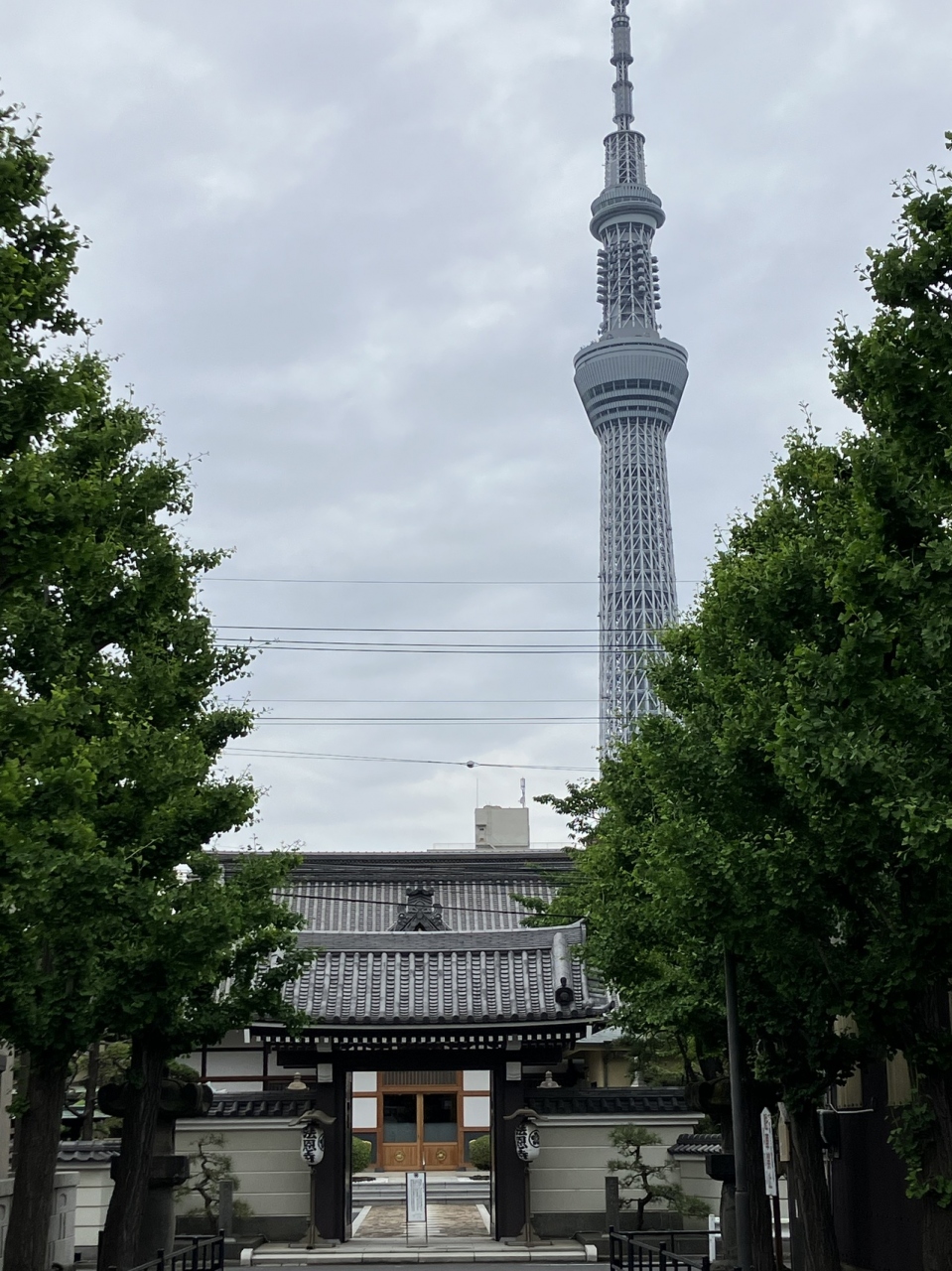 JR総武線「錦糸町駅」北口から北西方向へ徒歩で15分ほどです。太田道灌公が江戸城鎮守の祈願所として開基、日蓮宗寺院です。参道の奥にスカイツリーが聳え立つ景色が印象的でした。山門を潜ると正面に本堂、左手に白い三重塔の鐘楼、日蓮上人像、右手に「山吹の花」の記念碑がありました。江戸城築城に際して