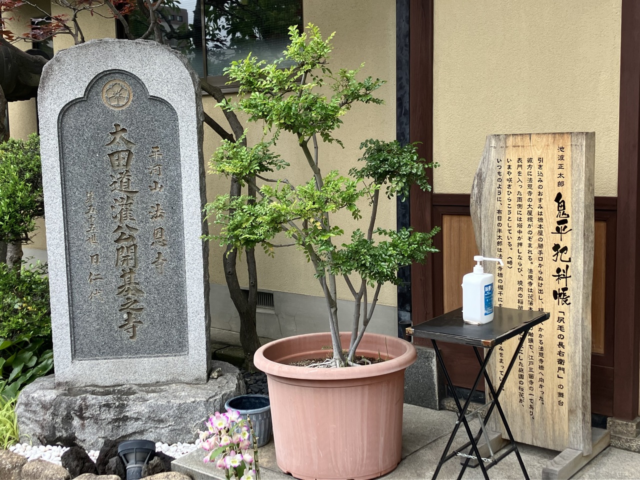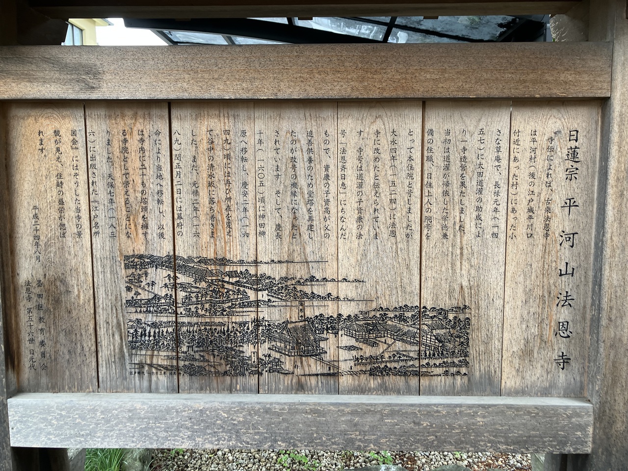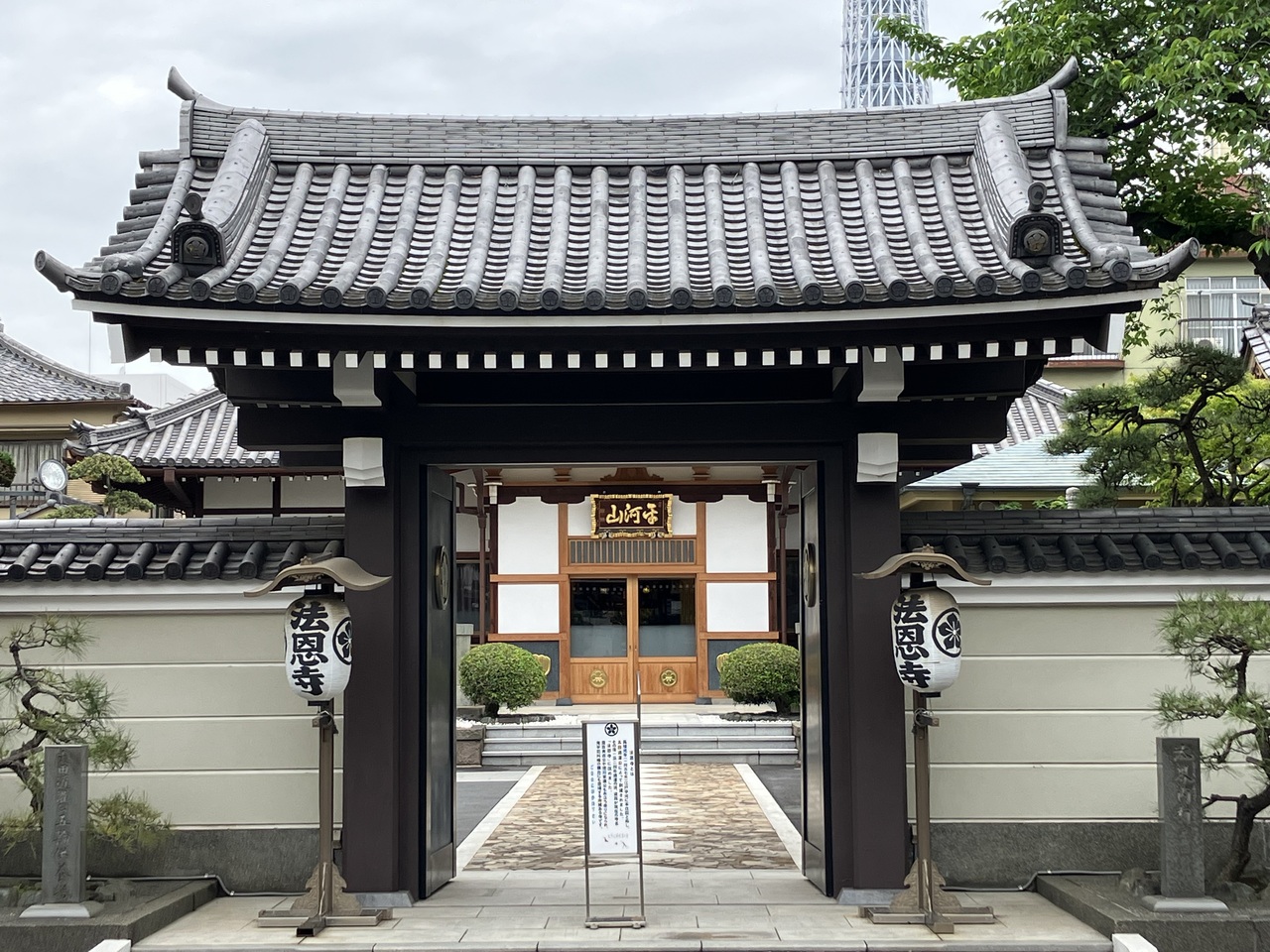 JR総武線「錦糸町駅」北口から北西方向へ徒歩で15分ほどです。太田道灌公が江戸城鎮守の祈願所として開基、日蓮宗寺院です。参道の奥にスカイツリーが聳え立つ景色が印象的でした。山門を潜ると正面に本堂、左手に白い三重塔の鐘楼、日蓮上人像、右手に「山吹の花」の記念碑がありました。江戸城築城に際して