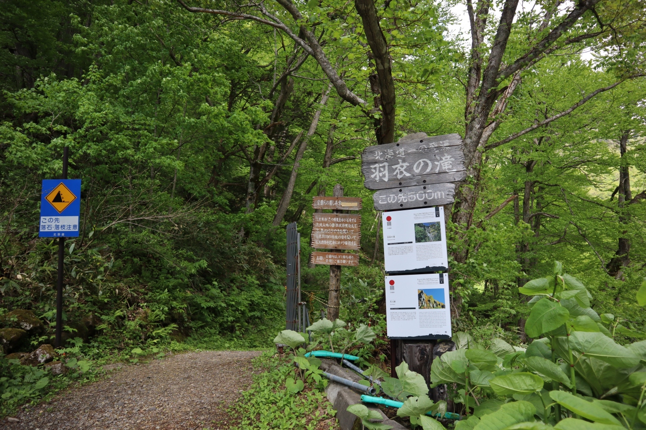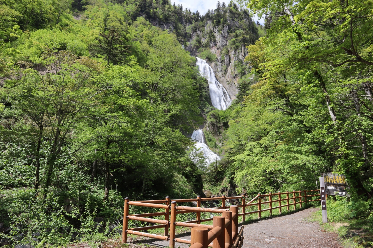 天人峡温泉から川沿いの遊歩道を15分くらい歩いたところにあります。一時期、土砂崩れで行けなかったようですが、今は遊歩道もきっちり整備されています。ただ、途中誰ともすれ違いませんでした。突然、目の前に二筋の滝が目に飛び込います。水量も多く、絶景です。