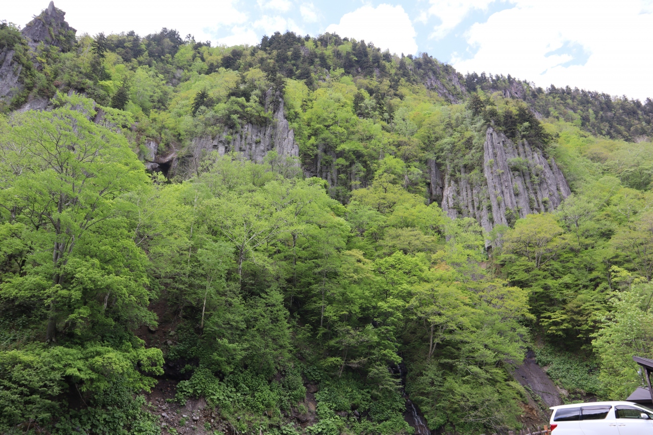 公共の交通機関はありません。旭川市街地から車で1時間ちょっとのところにあります。忠別川上流の柱状節理の渓谷で、大きな一枚岩の涙岩なども見どころです。15分くらい歩くと羽衣の滝もあります。柱状節理としては、層雲峡より規模は小さいです。