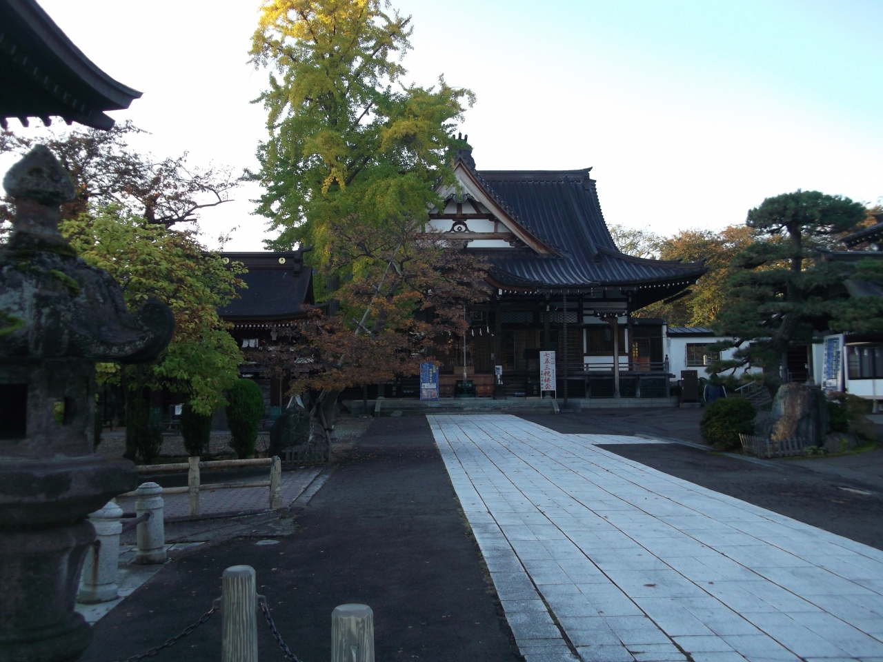 弘南鉄道の中央弘前駅から歩いて5分ほどのところにある、真言宗智山派の寺院です。堂々とした造りの山門をくぐるとすぐ左側に朱色の鮮やかな五重の塔がありました。さらに平石の参道が本堂まで続いています。境内は広く鐘楼や六角堂などもあり、ちょうど紅葉の時期で色づいたモミジに囲まれたお堂や塔を見ることができました。