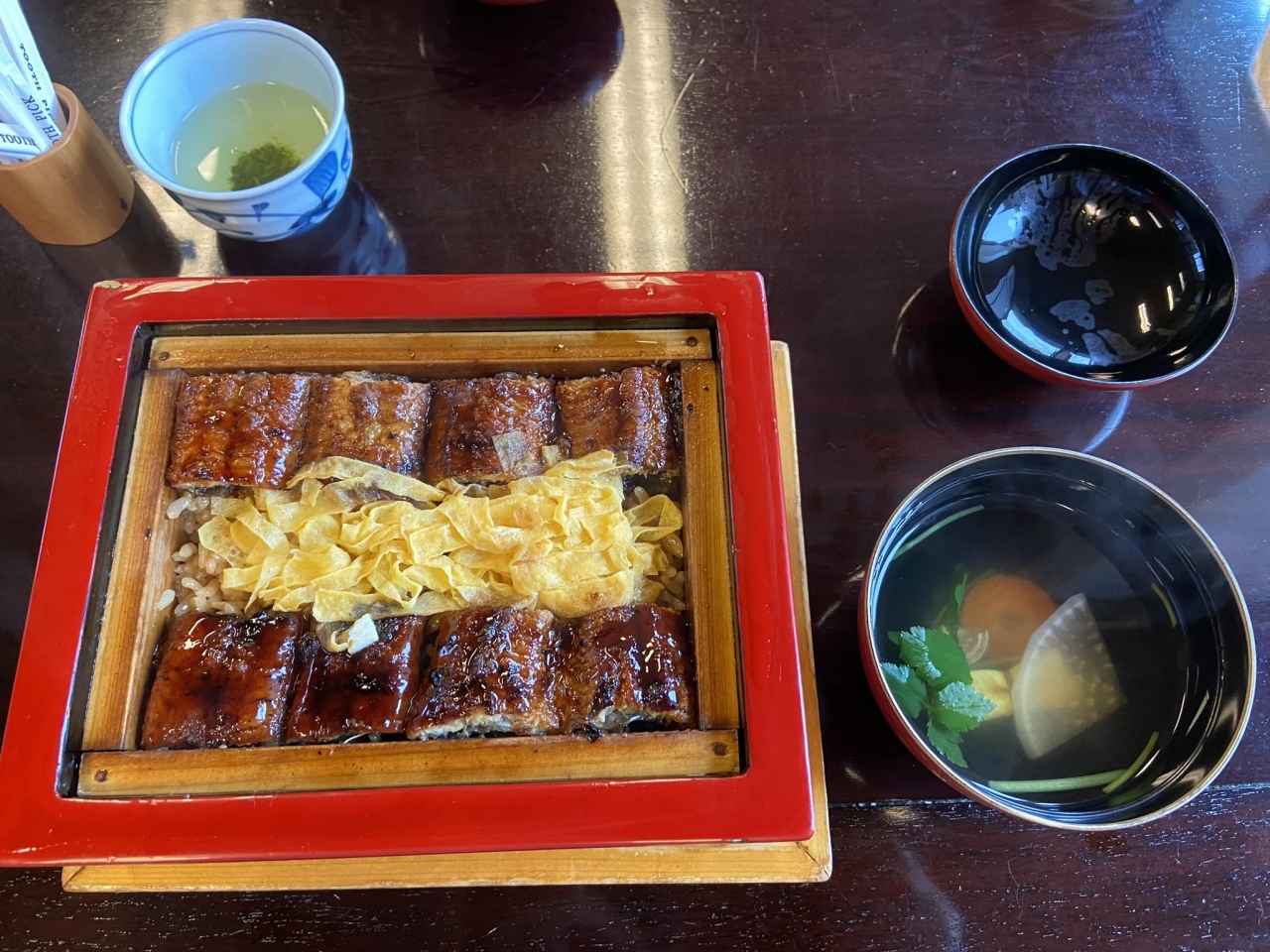 電話では予約はできないとのことで、店の外まで行列ができていた。30分ほど待って2階の座敷に案内され、やっとせいろ蒸しを注文、空腹もあって柔らかい身の厚く大きなウナギを堪能した。