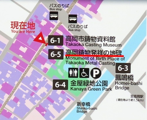 山町筋に続いて金屋町筋を訪れました。こちらも重伝建に登録されたエリアです。しかし、ここでもまったくと言っていいほど観光者には出会いませんでした。鋳物資料館の前で案内板を見てしばし立ち尽くしたのは付近の6か所のおすすめスポットを地図が示していましたが「高岡鋳物発祥の地碑」がアバウトにしか説明されていないことでした。これでは地図に書く意味ナシ。必要なのはこういう細やかな気づかいなんですよね。