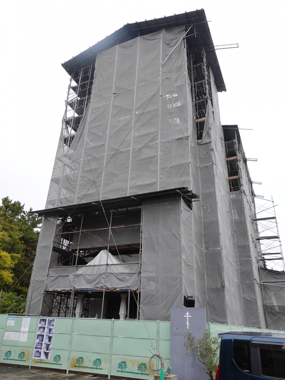 豊橋ハリストス正教会は、豊橋公園のすぐ南に位置しています。ガイドブックには木造2階建ての美しい姿が紹介されており、国の重要文化財にも指定されているということで楽しみにしていたのですが、長期工事中で全面幕で覆われており、全くその姿を見ることはできませんでした。