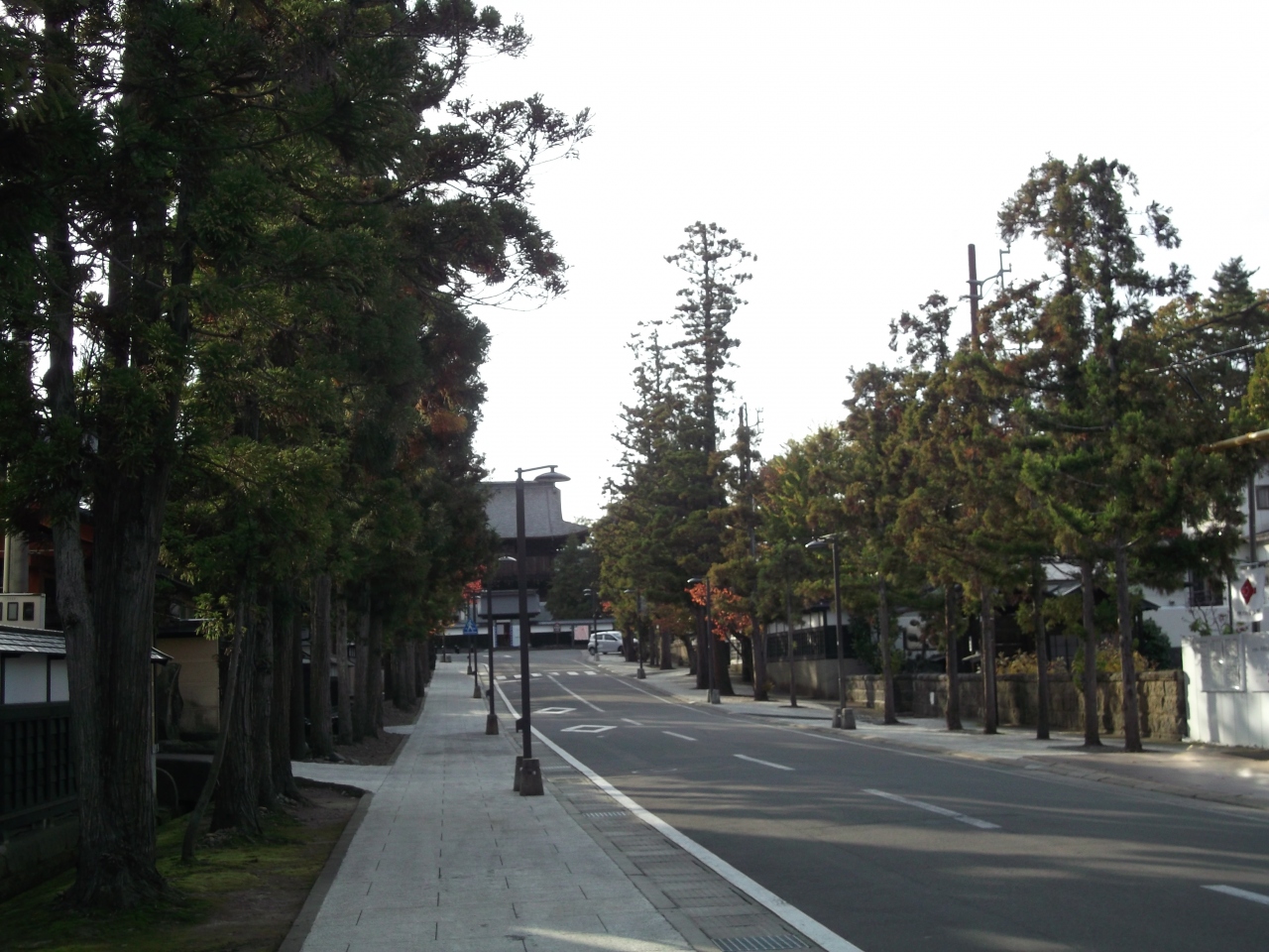 JR弘前駅からはやや距離がありますが、弘前城からであれば歩いて15分ほどのところにある通り沿いにお寺が並ぶ寺街です。長さは600mほど、入口近くの赤門のところで2つに分かれます。長勝寺までは幅の広いまっすぐな通りが続き、その両側には曹洞宗の寺院が並ぶように建っています。