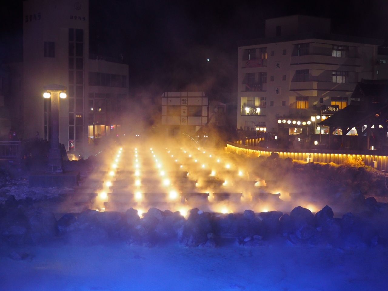 御座の湯は湯畑に面してある入浴施設です。石の湯と木の湯の2つの大きな湯船がありますが、日ごとに男女交互に使用しているようです。石の湯を利用しましたが、湯船の木の枠が石でできています。趣にある作りです。入浴後は2階の大広間の休憩でゆっくりするのがいいです。休憩室からは湯畑がよく眺められます。夜はイルミネーションがあるので、夜に訪れるのがよさそうです。