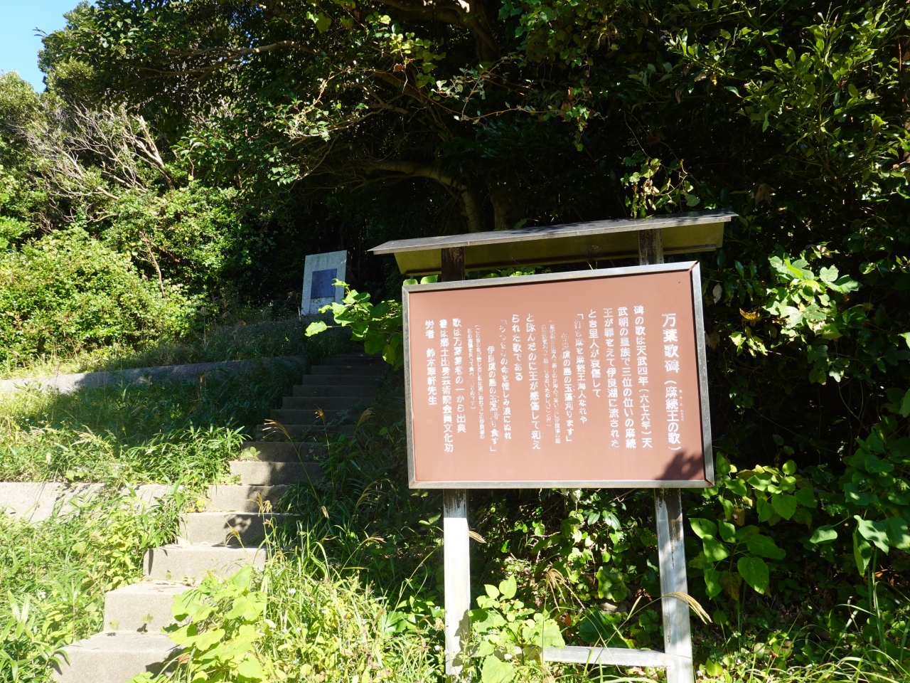 伊良湖岬の先端、伊良湖灯台のすぐ近くに「万葉の歌碑」があります。歌碑は階段を登った場所に緑に囲まれて建っていました。階段下には案内書きも設置されています。正直あまりに海が美しすぎて、歌碑自体はあまり印象に残りませんでした。