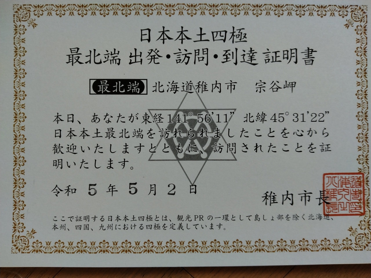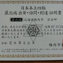 日本最北端の場所です。稚内駅からは路線バスが出ていますが、本数が少なく時間も1時間くらいかかりますので、注意が必要です。稚内に戻って観光案内所へ行けば、最北端出発・到着証明書を発行してもらえます。この証明書は日本の4極点と連携していて、東西南北の極点証明書を並べると、裏に絵が完成します。
