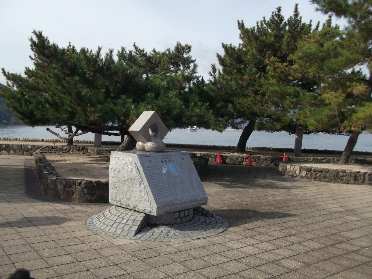 宮島のフェリー乗り場前の広場の一角に、この石碑が建っていました。世界遺産に登録されたことを記念して2000年に建てられたもので、細かい説明の刻まれた台座の上に中央に大きな穴の空いた四角形のモニュメントが載っています。モニュメントの形の意味はよくわかりませんでしたが、世界遺産に登録されている場所であることを訪れる人に伝えています。