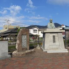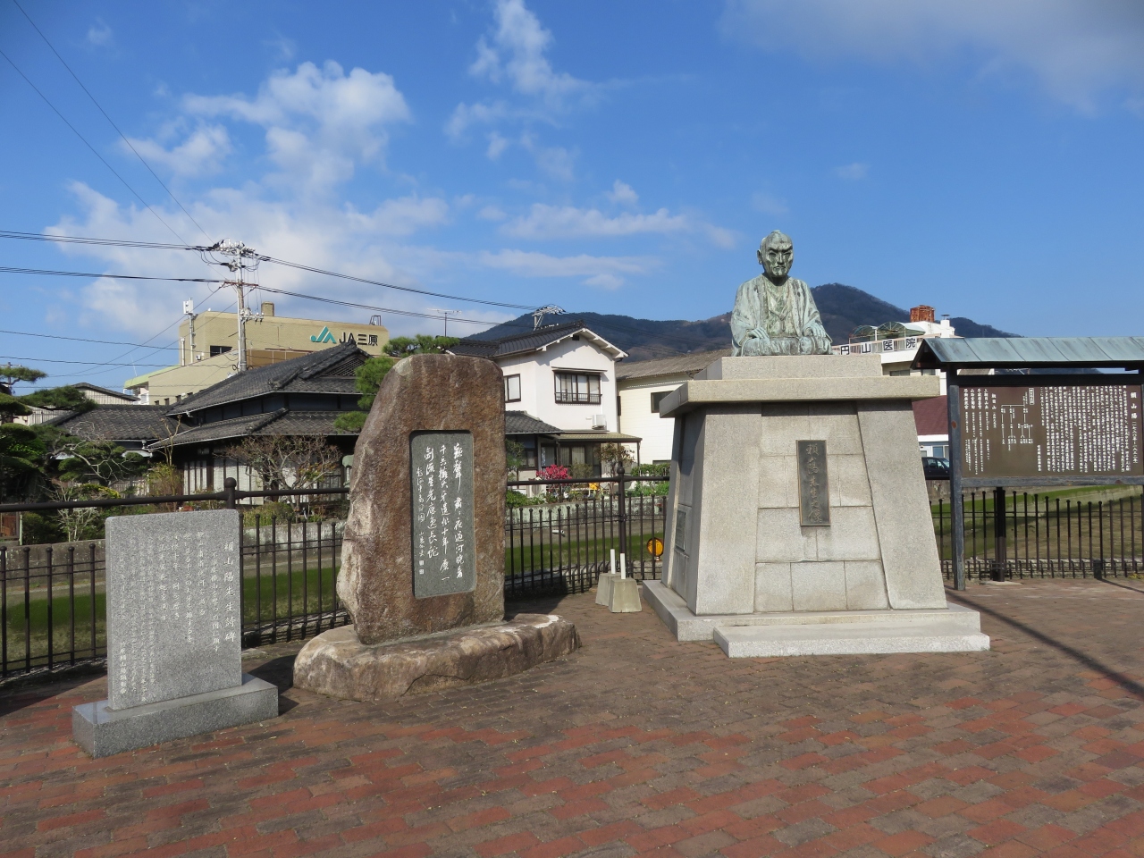 川沿いにある広場で頼山陽の像がありました。この地の出身でもないのですが父親が竹原出身の為建てたのでしょうか。ちょっと無理があるかなと感じます。広場には特に何もないのですが、たけのこの車除けがかわいらしく地面からニョキっとタケノコが出ているようでした。