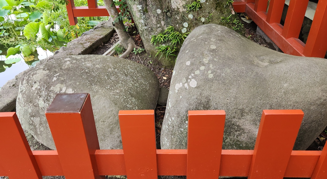 朱塗りの柵に囲まれていますが二つ石があり北条政子が懐妊した時に安産を願ったものだそうで、現在は恋愛成就のパワースポットになっているそうです。