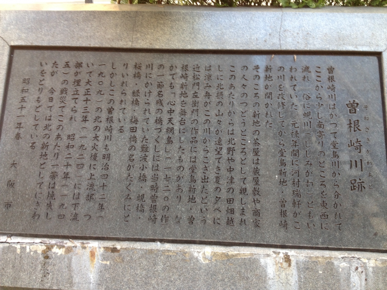 桜橋、浄正橋、それから堂島大橋に対しての堂島小橋など、堂島川のそれとは明らかにもう一本、川が流れていた気配があるなあと思っていました。曽根崎川、別名の蜆川という川が1909年(明治42年)から段階的に、災害がれきなどで上流から埋められ、1924年(大正13年)に下流が埋められるまで流れていたようです。