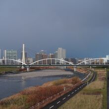 豊平川サイクリング園路は、札幌市を南北に流れる豊平川に沿って整備されたサイクリングコース。総延長は11キロもあるようです。写真は豊平橋から眺めたもの。視界は広々。アスファルトできれいに舗装されていて走りやすそうなコースでした。