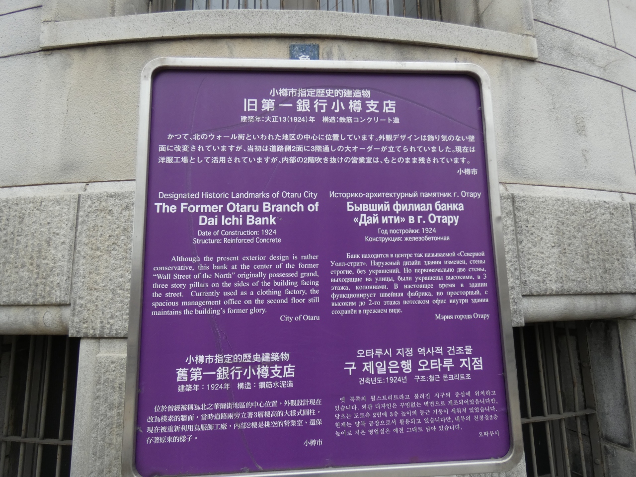 観光客で賑わう堺町通りから於古発川を越えて色内大通りに入って直ぐに建つ小樽市歴史的建造物第24号の旧第一銀行小樽支店。大正13年(1924)建築の鉄筋コンクリート4階建ての銀行建築です。かつて北のウオール街と言われた地区の中心に位置しています。小樽が経済の中心であった時代が偲ばれる建造物です。現在は洋服工場兼事務所として利用されています。