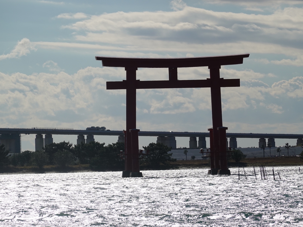 弁天島海浜公園から南側(海側)を見ると、海の中に聳えるように立つのが「舞阪町観光シンボルタワー」で、1973年に建てられた比較的新しいものです。公園からの眺めは最高で、鳥居の先には浜名大橋が控えるダイナミックな光景です。訪れたのが13時半頃だったので、もろに逆光だったのが悔やまれます。次回は夕陽を見てみたいと思いました。