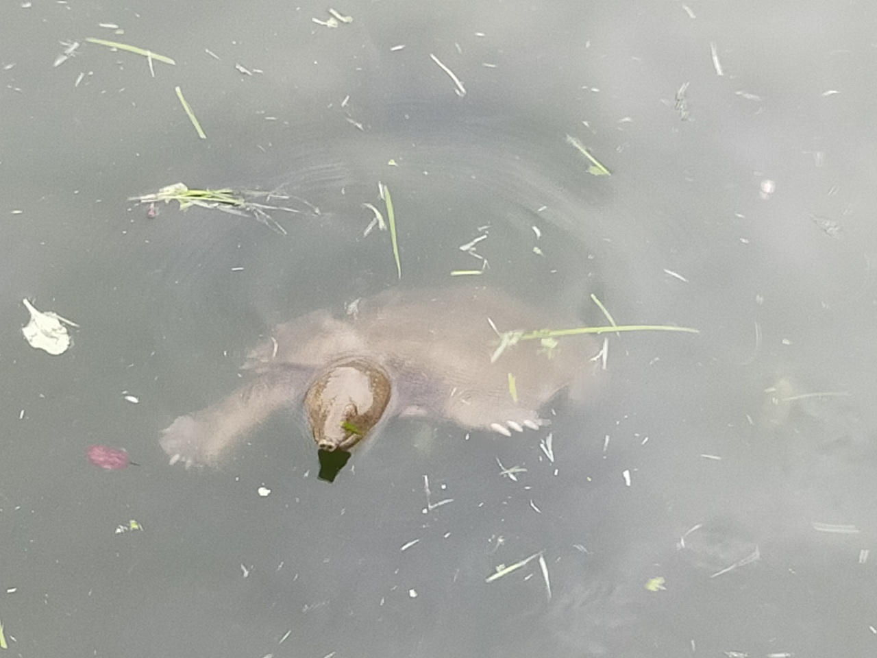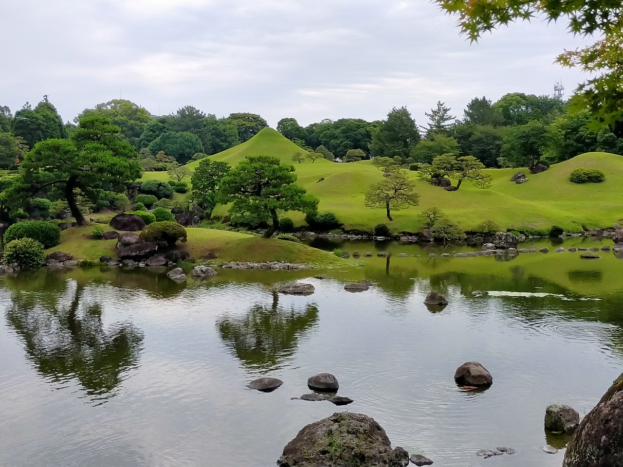 阿蘇の伏流水が流れる澄みきった池のある回遊歩式庭園です。富士を模した富士築山があります。池には幸福の白いスッポンのスイちゃんとフクちゃんがいます。大きな方のスイちゃんを見つけましたが、真白というよりも、少し白みがかった感じでした。