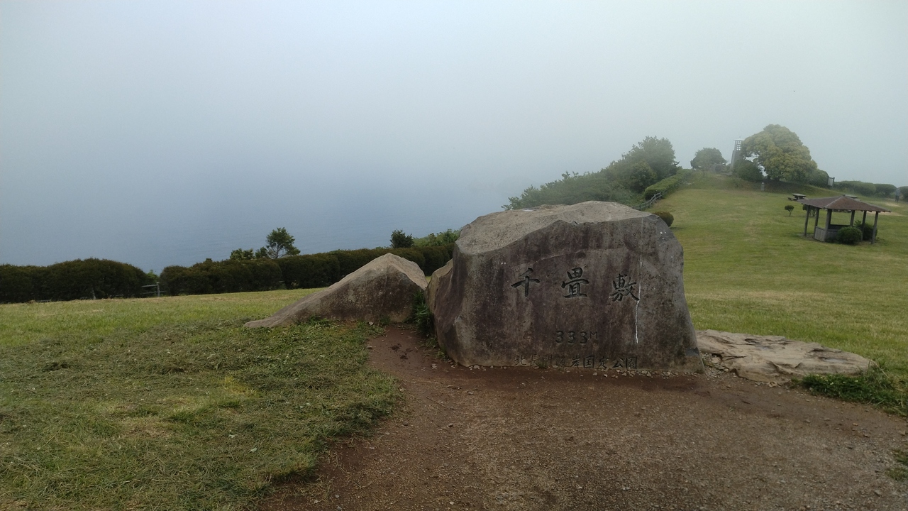 千畳敷は、平らに広がった地形を、畳千畳の広さに形容表現しているようにここにこんな平らなところがあるのも珍しい。この日は霧がかかって展望はできなかったが、333mあるので北側には日本海が一面に広がり、萩六島村や見島が見渡せ、空と海が一望できる風光明媚な場所として人気。無料駐車場もあります。