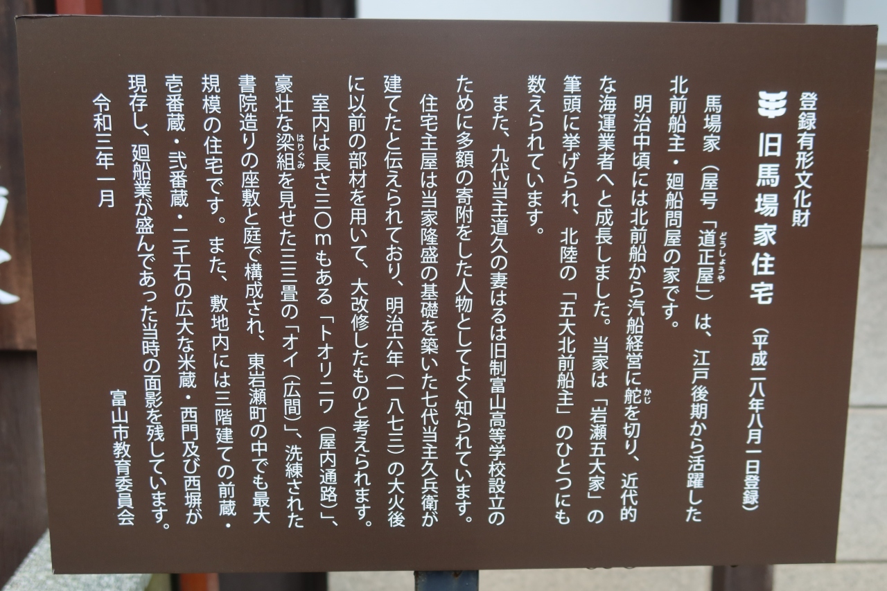富山市の沿岸部 東岩瀬のメインストリート沿いに旧馬場家住宅があります。北前船で栄えた商家の中でも一番格上の名家で、その住居には母屋、前蔵、壱番蔵等5つの建物が有形文化財に指定されています。縁側の廊下からガラス越しに見るお庭は奥ゆかしい雰囲気があって好きになりました。