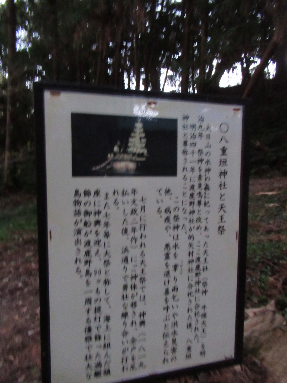 八重垣神社は、元は渡鹿野神社と称し古くから存在していて、現在は須佐之男命(スサノオノミコト)別名「牛頭天王」をお祀りしています。