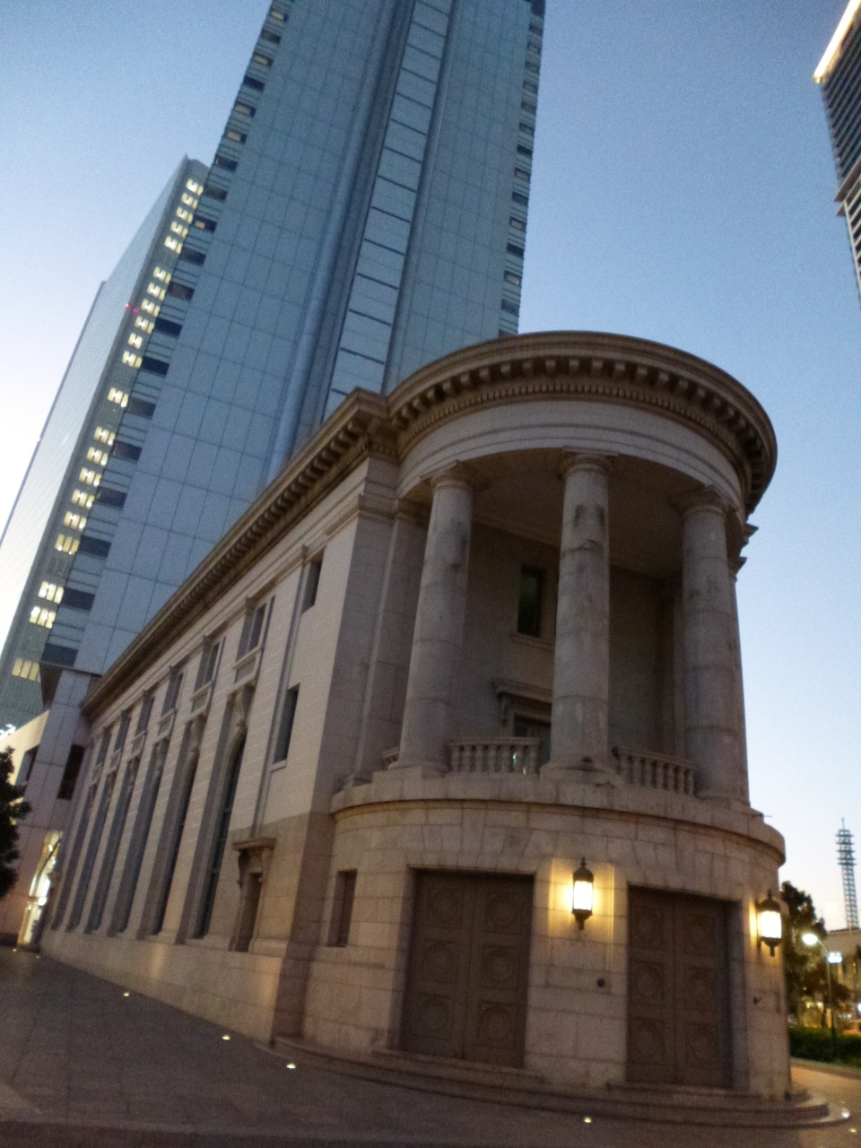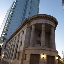 新しいガラス張りの横浜新市庁舎の東側に、横浜アイランドタワーがあります。1929年に竣工した旧横浜銀行本店別館を保存したもので、上見上げると、27階建てのビルがそびえています。2002年槇文彦氏の設計によるものだそうです。特徴であった先端にトスカナ式オーダーの列柱を並べた半円形のバルコニーは約1ヶ月程度を費やして約170mの曳家工事が行われたそうです。
