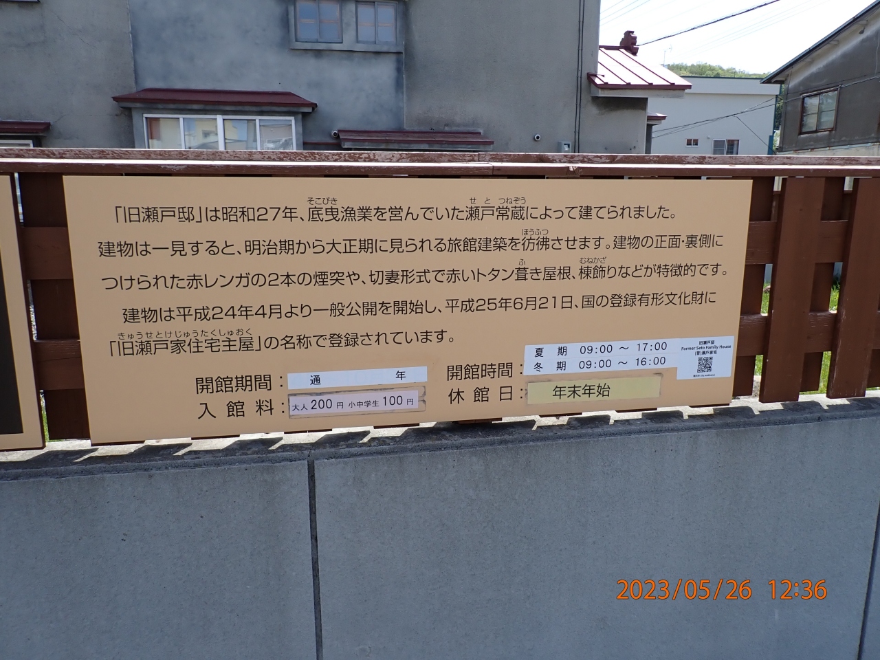 稚内市観光で立ち寄りました。旧瀬戸邸は、昔、にしん漁と底引き漁業で繁栄した当時の建物で、登録有形文化財です。お客は我々だけでしたが、受付の方が20分程かけて丁寧に建物内を案内してくれました。外観からは想像もつかないような立派な造りの建物でした。入館料は200円ですが、個人的にはお勧めです。吉永小百合さん出演の「北の桜守」の撮影も行われたそうです。