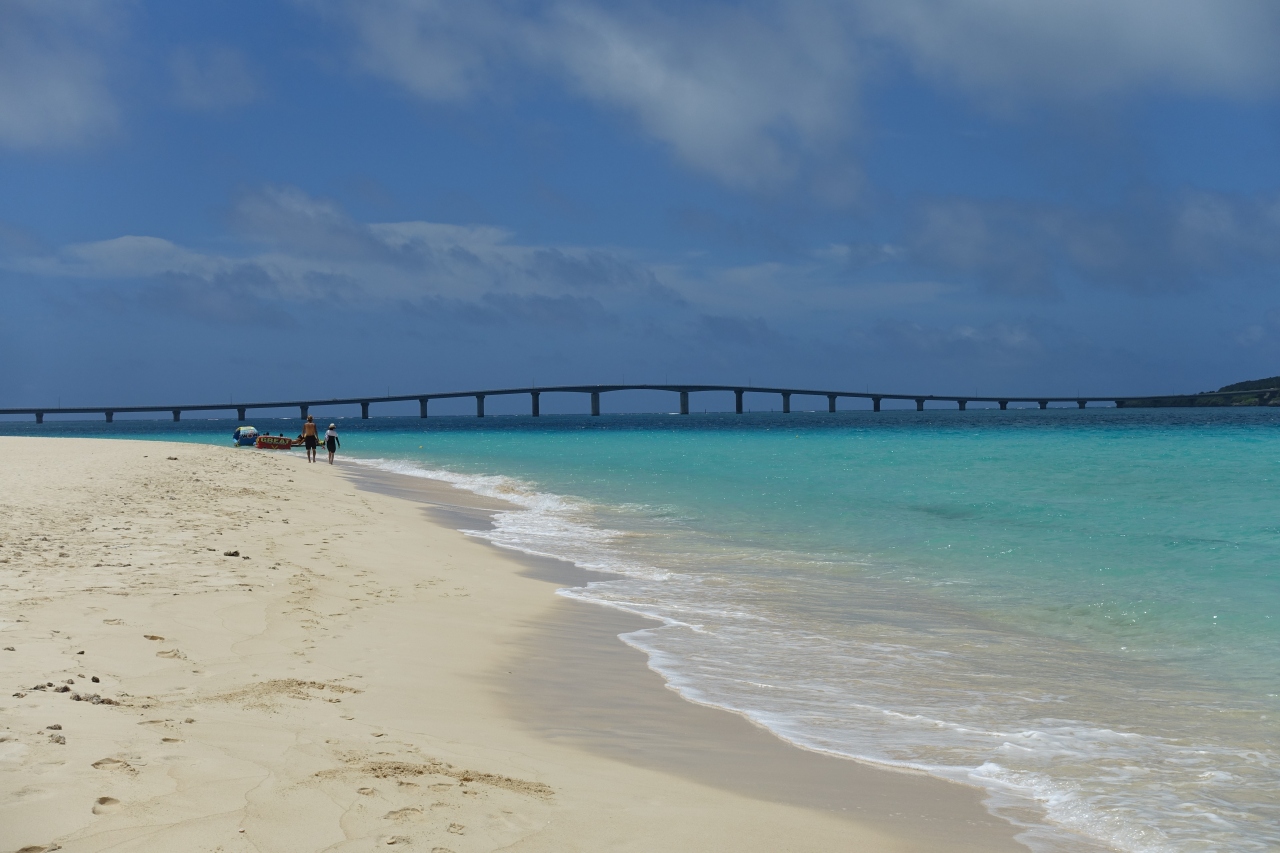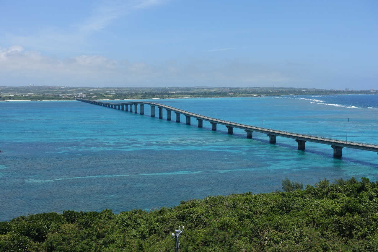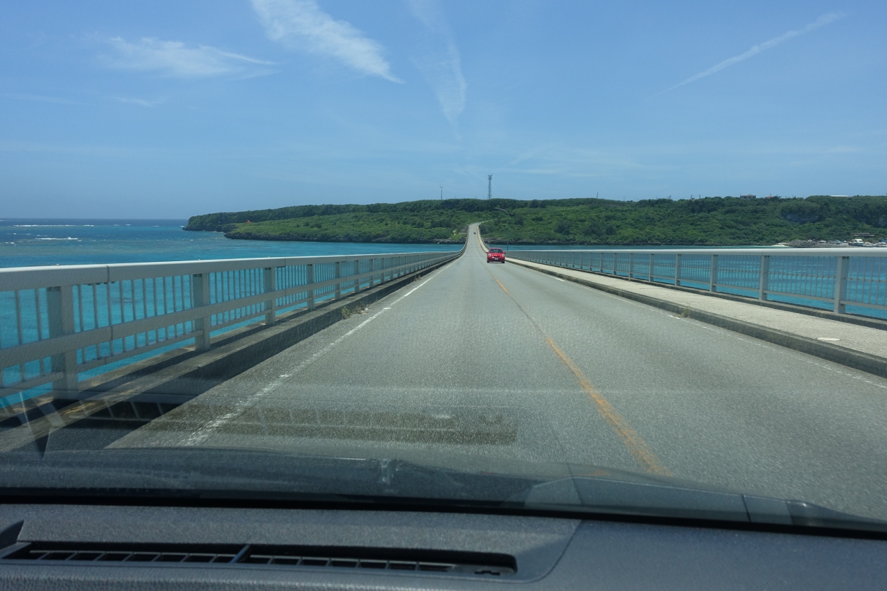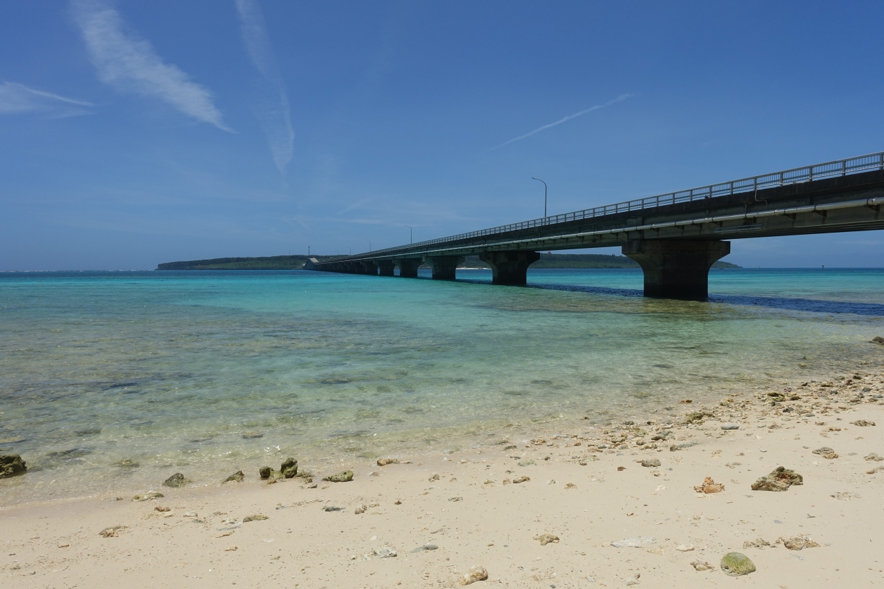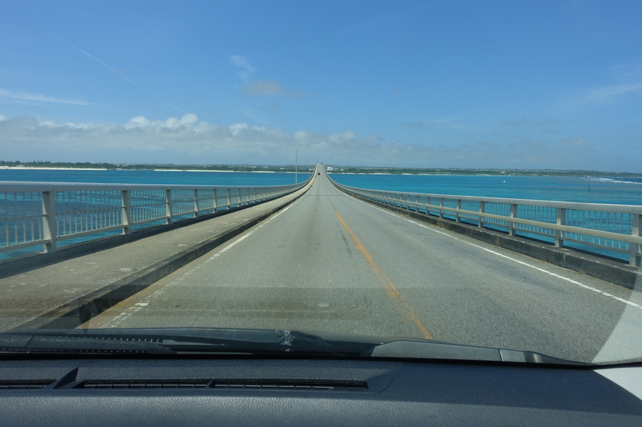 宮古島本島と来間島を結ぶ橋。船舶が橋の下を航行できるよう中央部分は盛り上がり勾配があります。両側は美しい海が広がっていますが、橋の上は駐停車禁止なので車を停めて景色を眺めることはできません。自転車や徒歩で渡れば好きな場所で停まれますけど、暑い中歩いて渡る気になれなくていまだに実行したことは無いです。