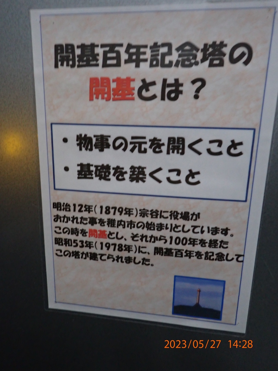 稚内市観光で立ち寄りました。稚内市開基百年記念塔は、稚内公園にある目立つ塔でした。定期観光バスを利用して立ち寄りました。生憎のお天気で塔の展望台からの景色は残念な状態でした。建物が老朽化してきているので、数年で上れなくなるかもしれないとガイドさんが言ってました。