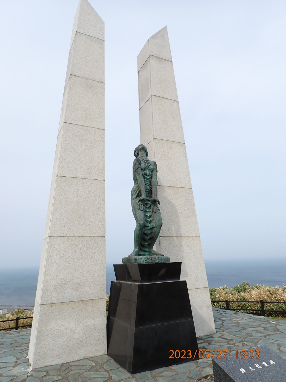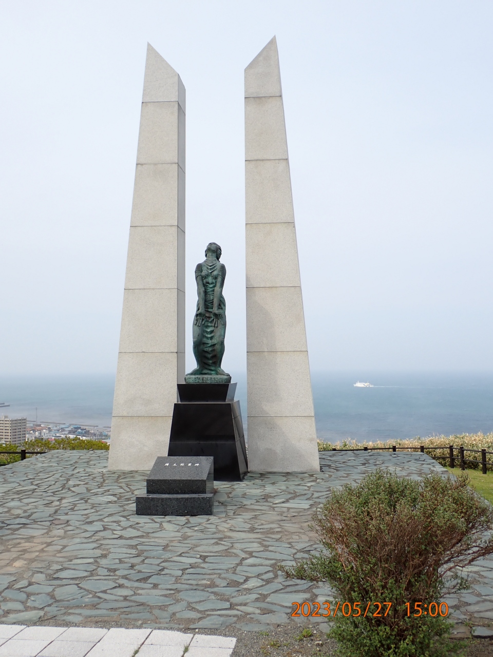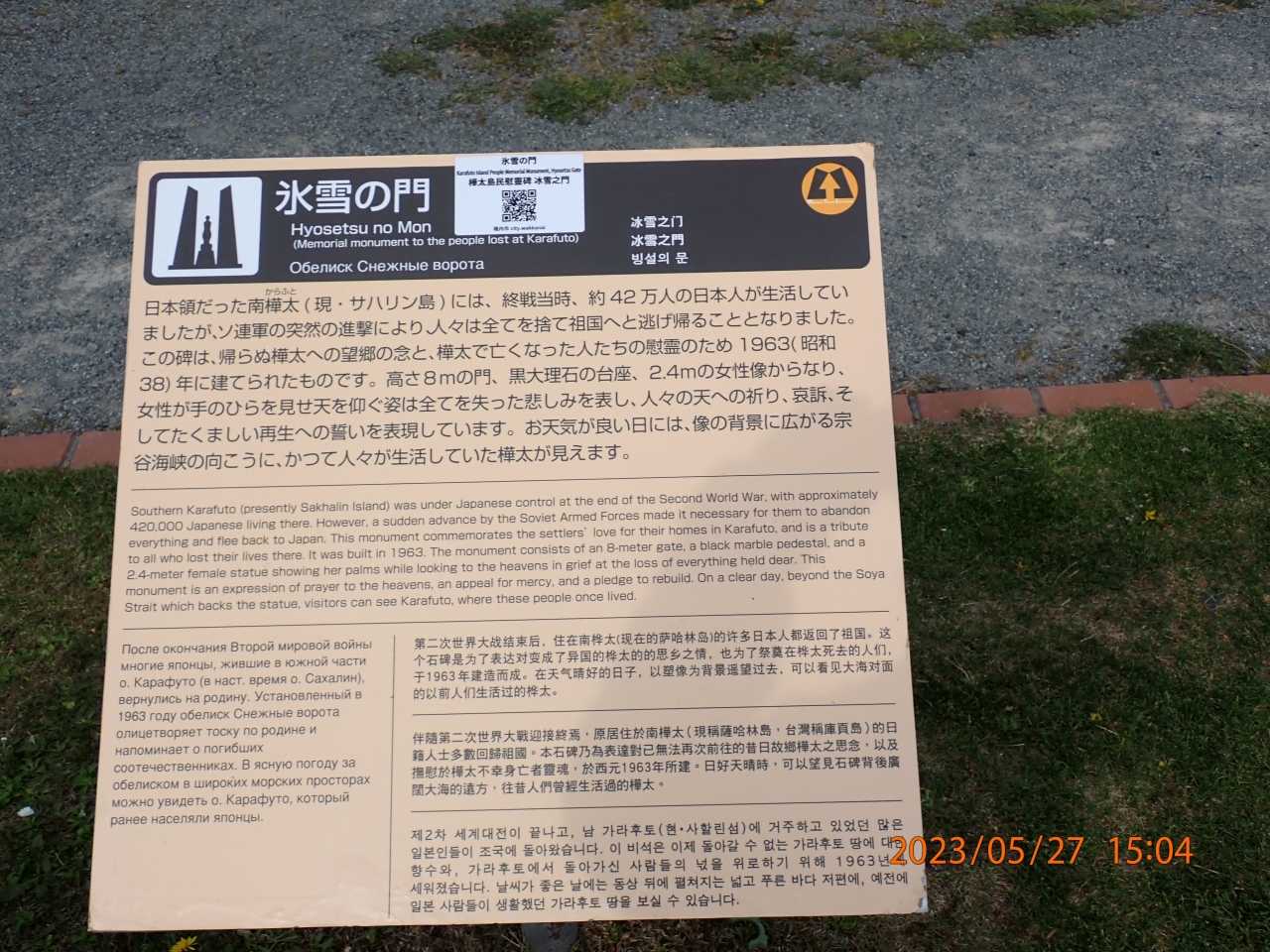 稚内市観光で立ち寄りました。氷雪の門は、稚内公園の北寄りに建っていたモニュメントで、説明板によると、日本領だった南樺太には、終戦当時、約42万人の日本人が生活していたそうで、ソ連軍の進撃により、全てを捨てて祖国日本へ逃げ帰ることになったそうです。この碑は、帰らぬ樺太への望郷の念と、樺太で亡くなった人たちへの慰霊碑だそうです。
