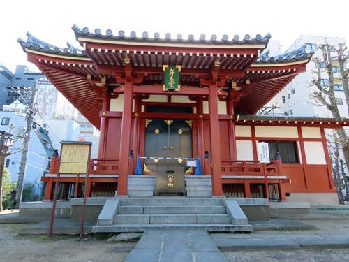 浅草寺は本堂の左手、西側に堂宇や史跡が多数ありますが、向かって右手の南東側にある小高い弁天山は見落としがちかもしれません。ここには弁天堂や鐘楼が建っています。弁天堂の再建は1983年(昭和58年)なので比較的最近ですね。本尊は「老女弁財天」の別称を持ち、関東三弁天のひとつとされています。