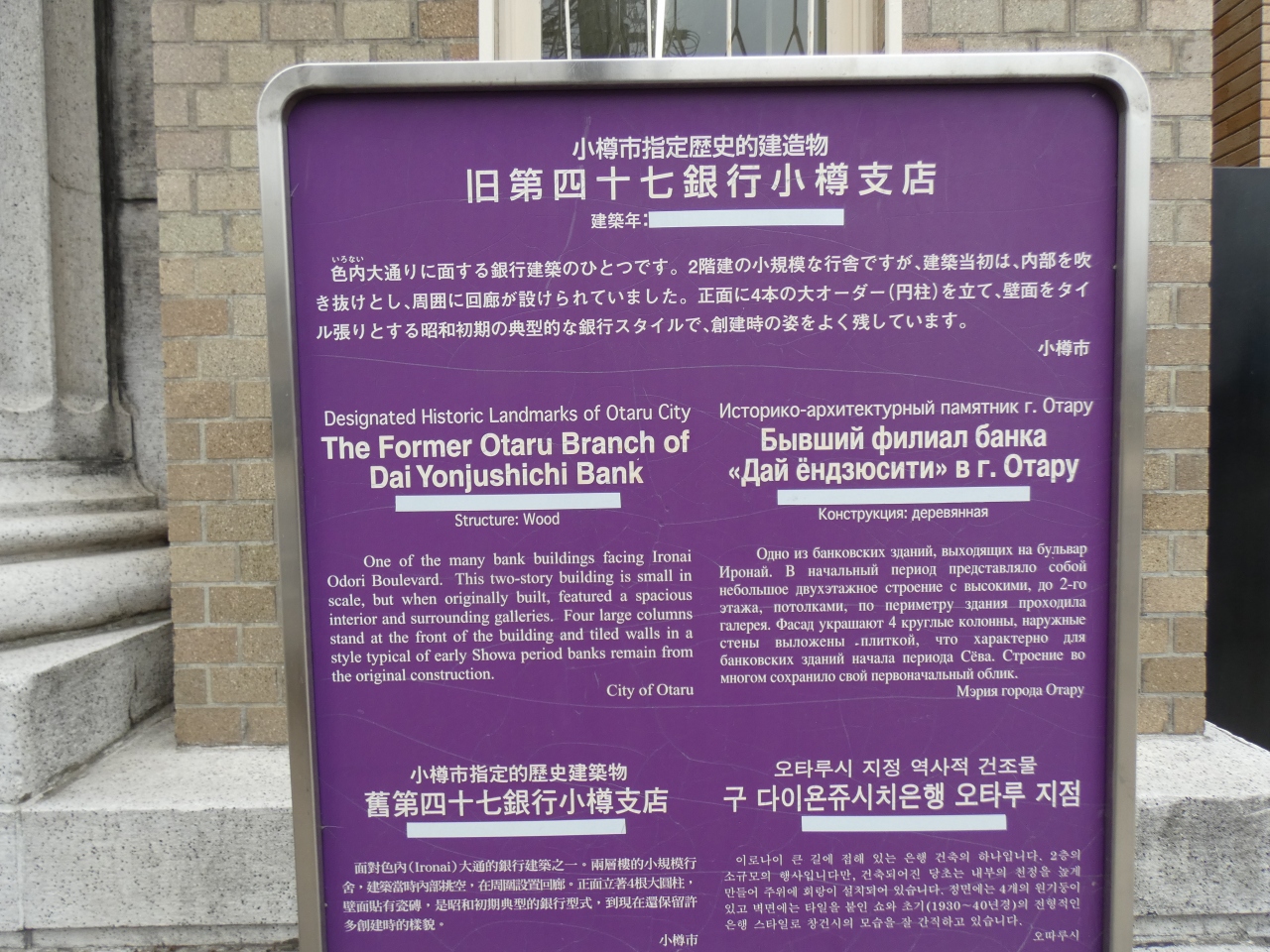 北のウオール街の色内大通り沿いに建つ小樽市指定歴史的建造物第25号の建物。昭和11年(1936)建築の木造2階建て、第四十七銀行小樽支店として使われました。2階建ての小規模の建物で、ギリシャ様式の円柱が正面に4本建ち重厚感を出しています。