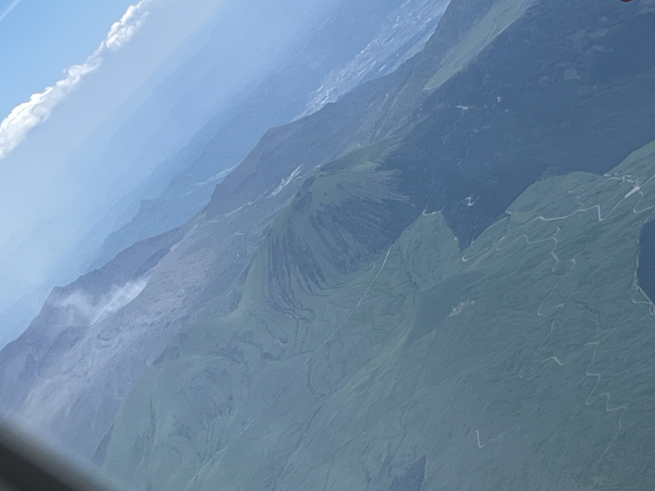 羽田空港から熊本空港へ向かう途中、下に見えました。横から見ると、お釈迦様が寝ているように見えますが、上からだと、噴煙が上がっているのが見えます。山に詳しいわけではありませんが、その噴煙が上がっているという特徴から、阿蘇山だと分かりました。入山規制もされているので、真上からとは行きませんが、眺められてよかったです。