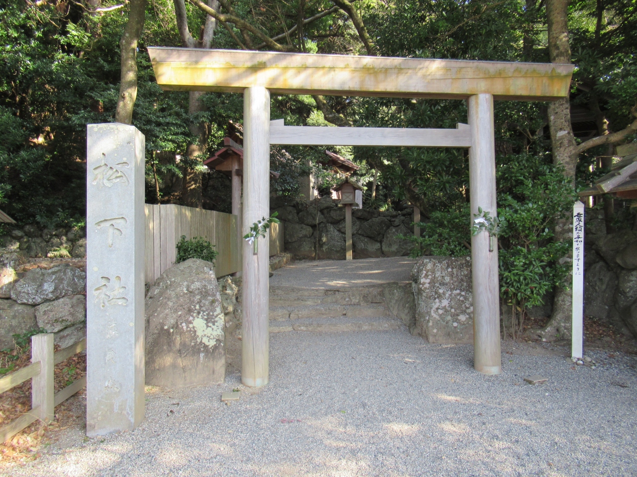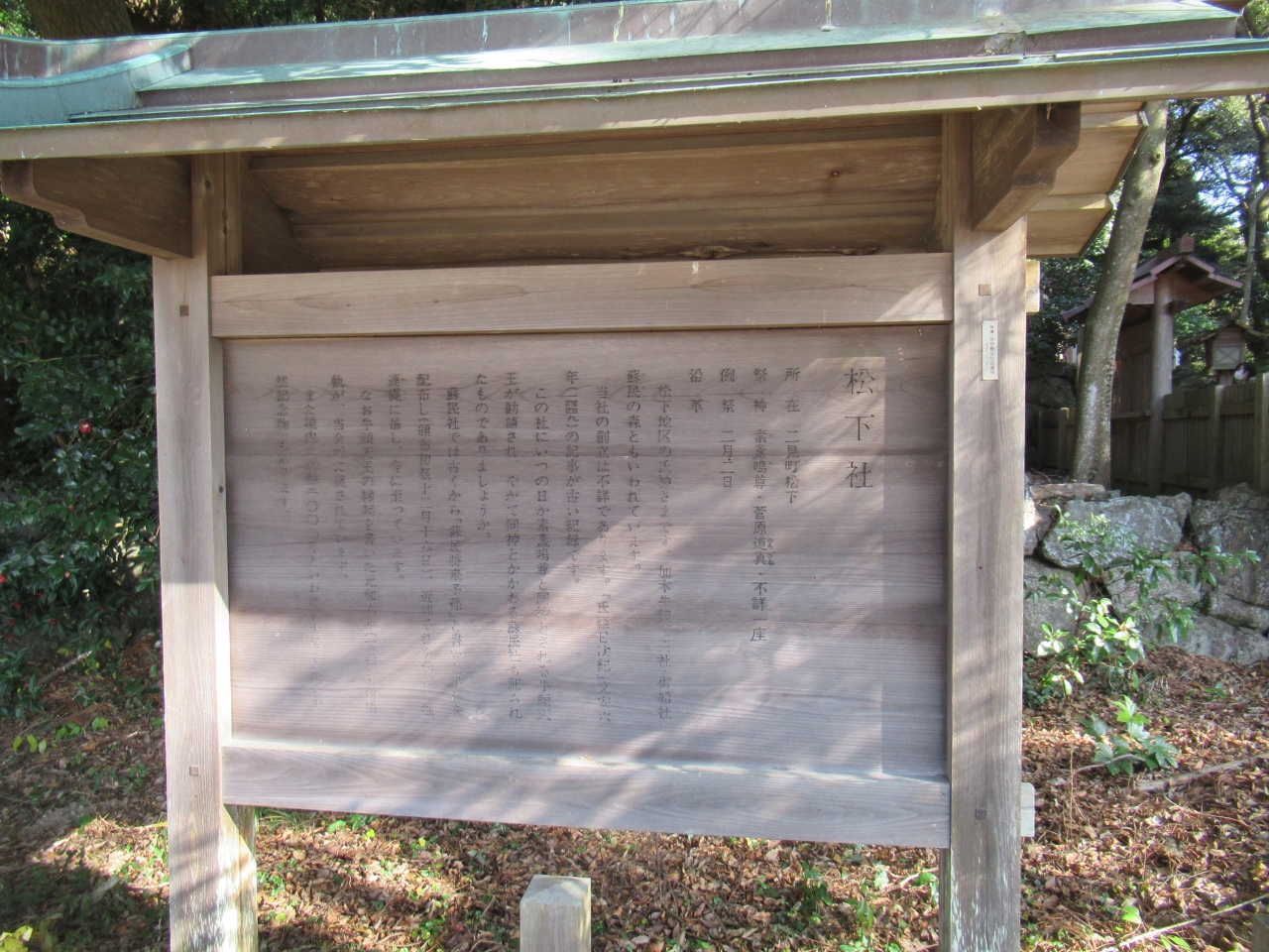 松下社は、二見町松下地区の氏神さまで、御祭神は、素戔嗚尊(すさのおのみこと)のほか、菅原道真と不詳一座を合わせて三座です。