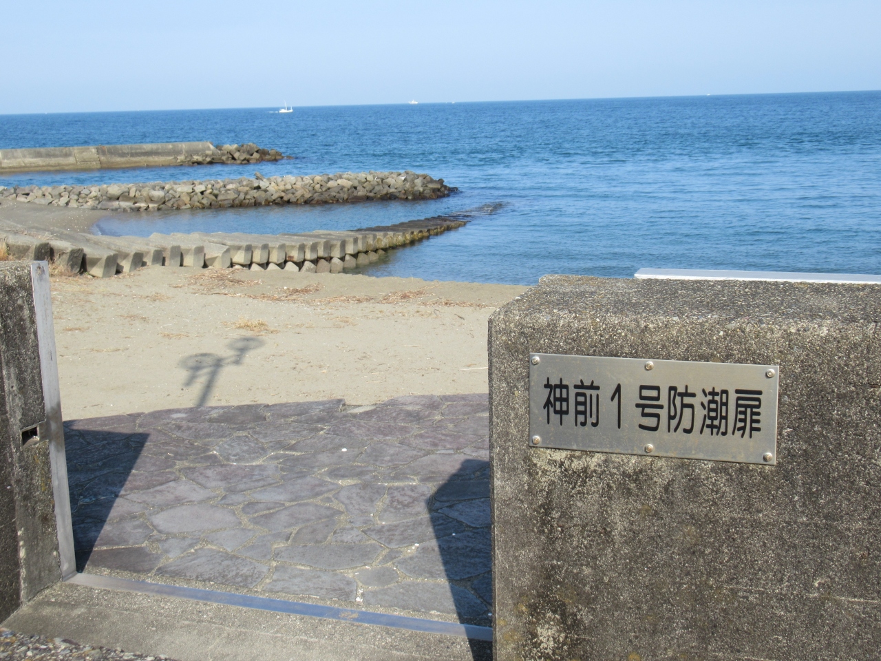 神前(こうざき)海岸は、伊勢市二見町松下にある海岸で、場所は観光地の夫婦岩、二見輿玉神社、伊勢シーパラダイスの東にあります。