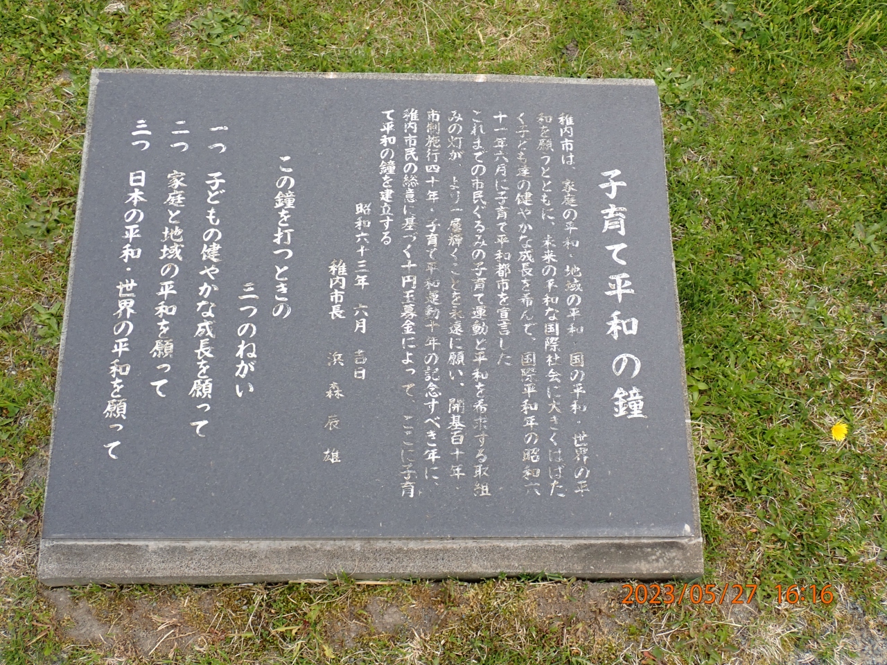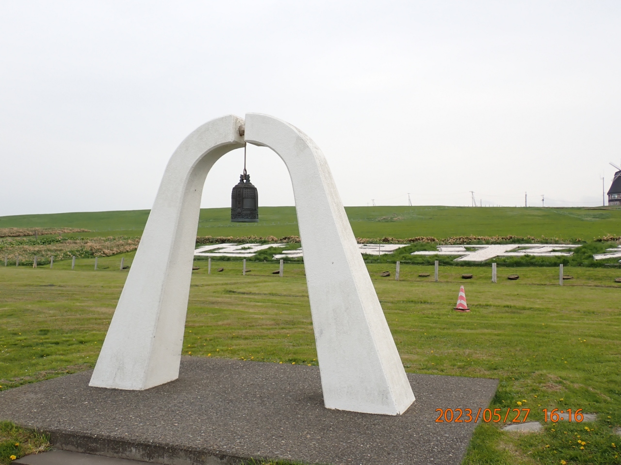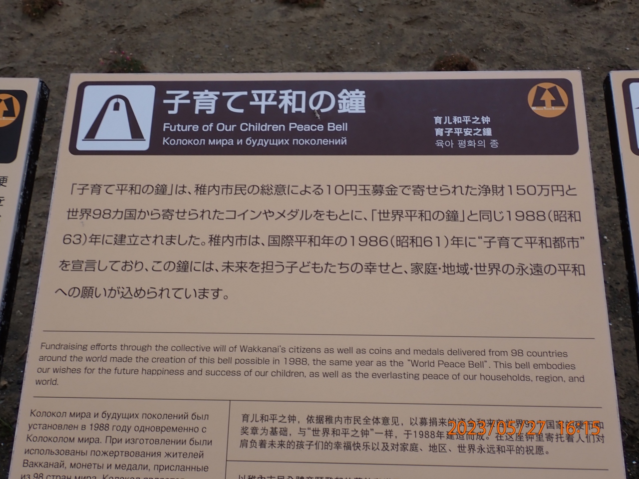 稚内市観光で立ち寄りました。子育て平和の鐘は、宗谷岬公園にある「世界平和の鐘」の隣にありました。説明板によると、市民の総意で行われた10円玉募金で寄せられた浄財により、昭和63年(1988)建立されたそうで、鐘の大きさは高さ45㎝、直径は25㎝程度のものとのことです。