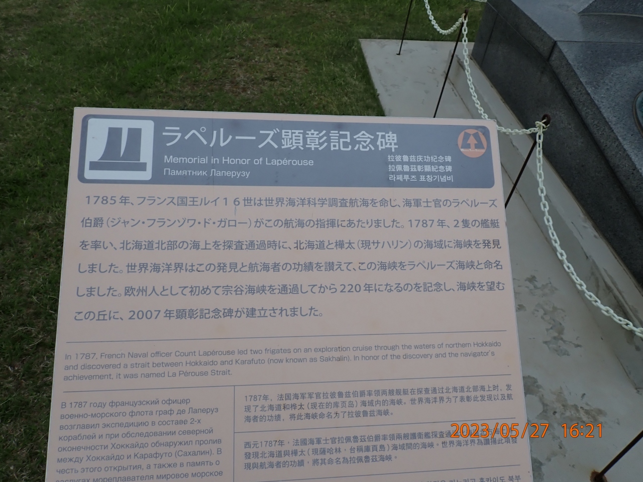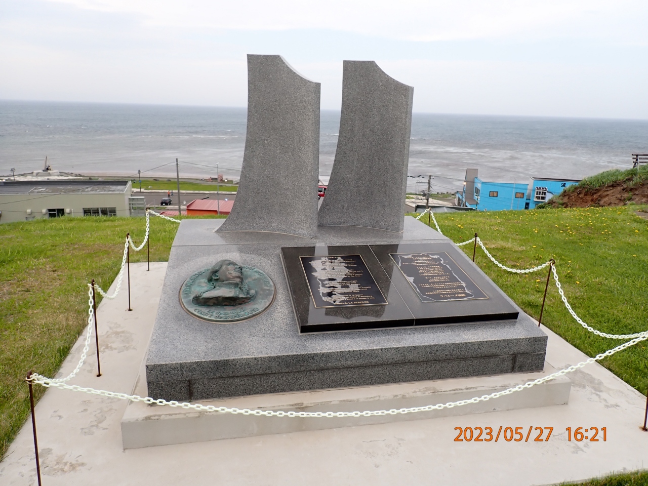稚内市観光で立ち寄りました。ラペルーズ顕彰記念碑は、宗谷岬公園にあり、「宮沢賢治文学碑」の北にあります。ちょっと雰囲気の変わった記念碑で、説明板によると、ラペルーズ伯爵がヨーロッパ人として初めて宗谷海峡を通過したそうです。ラペルーズ伯爵は、残念ながら、オーストラリア出港後行方不明となり、故郷のフランスには戻れなかったそうです。