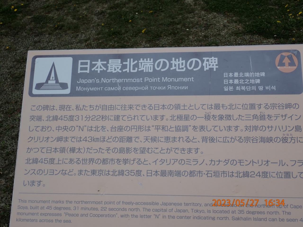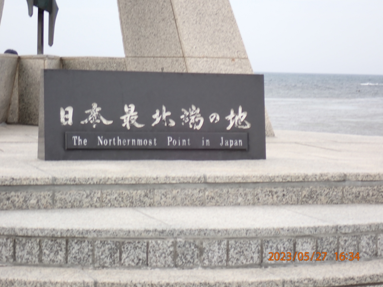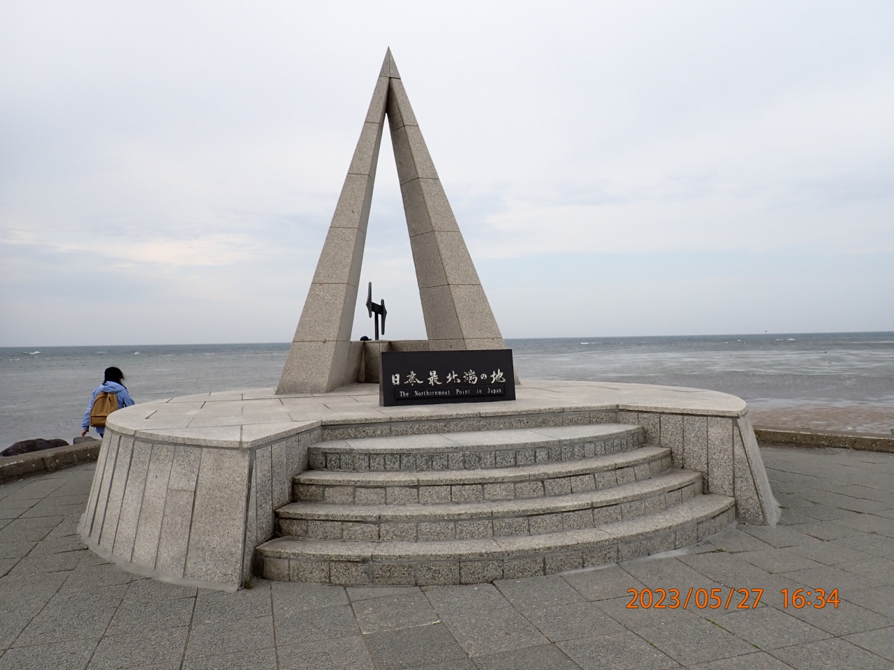 稚内市観光で立ち寄りました。日本最北端の地の碑は、宗谷岬にあるモニュメントで、説明板によると、通常の交通手段で到達できる我が国最北端の地に建てられているそうです。碑は、北国のシンボル北極星の一稜をかたどった三角錐をデザインしたもので、塔の中央にあるNの文字は「北」を、そして台座にの円形は「平和と協調」を表しているとのことです。