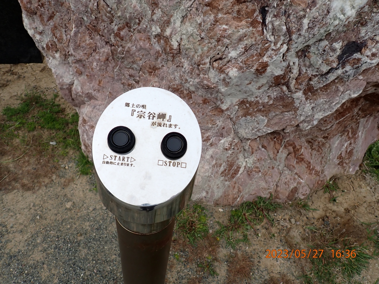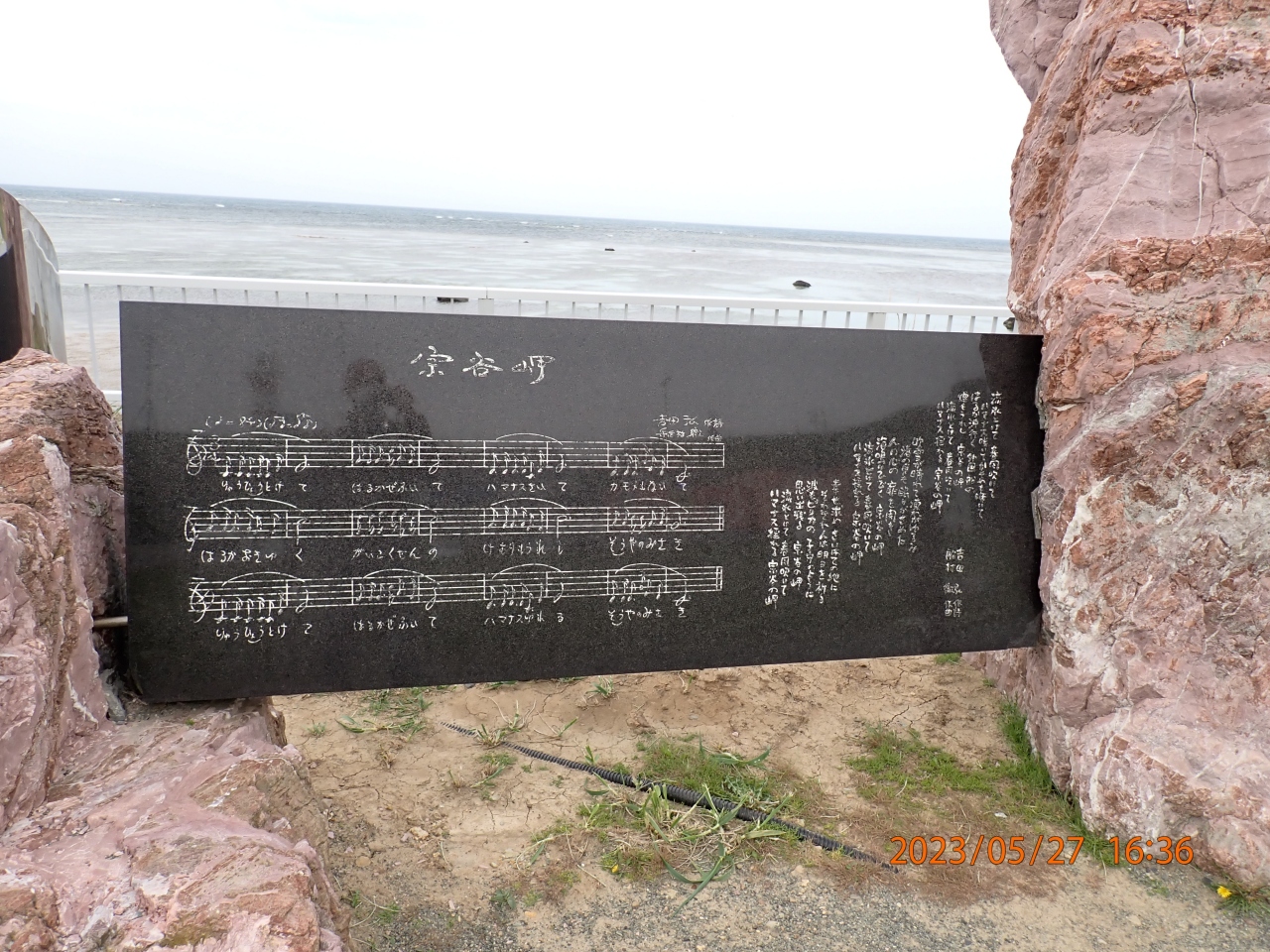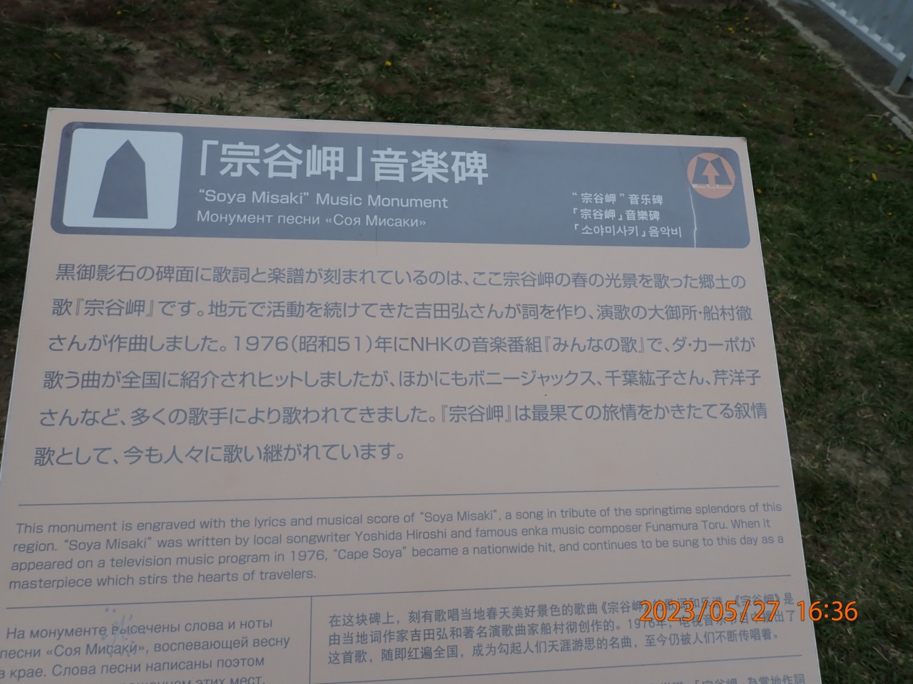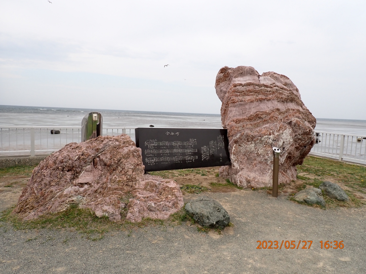 稚内市観光で立ち寄りました。宗谷岬音楽碑は、宗谷岬にある日本最北端の地の碑から東1分の所にあります。大きな岩の前に操作板があり、ボタンを押すと「宗谷岬」の曲が流れる様になっています。説明板によると、黒御影石に“宗谷岬”の歌詞と楽譜を刻んだもので、NHKの「みんなの歌」でも全国に紹介されたそうです。