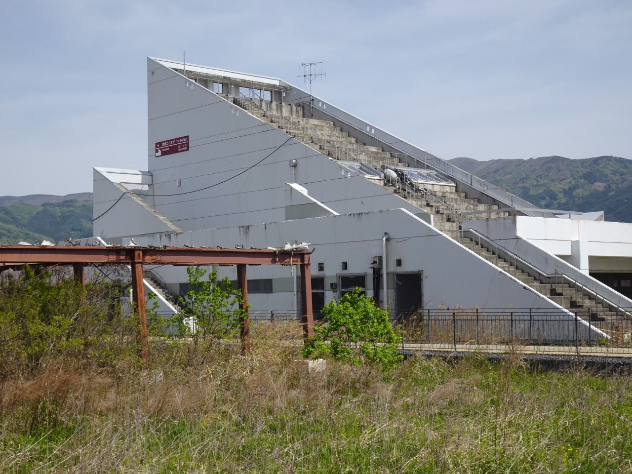 側面から見ると三角形の建物は、元々津波の避難施設として堅牢な構造だったことから、遠目では被災した様子は分からないほど。なお損傷が激しい建物内へは立入できません。