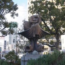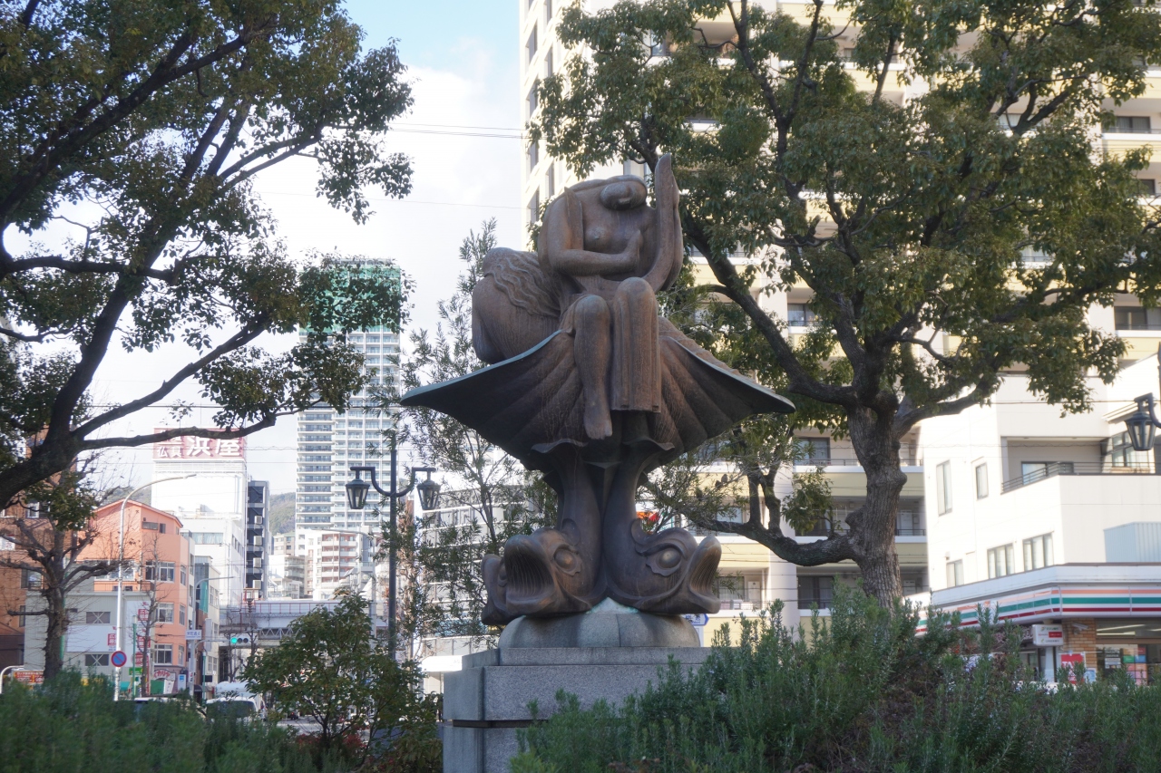 ポートセンター街園は、乙仲通の中ほど、ロータリーの中央にあるちょっとしたスペース。東西どっちからいっても横断歩道を渡って通りに挟まれた場所へ入ります。銅像が置かれたりしていますが、周囲は草が生えてちょっと荒れた感じ。あんまり落ち着ける場所ではありません。