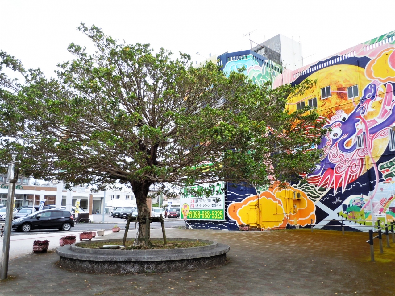沖縄市の国道330号線コザ十字路交差点、銀天街・コザ十字路バス停から直ぐのところに「コザ十字路歴史絵巻・コザ巨大壁画」があります。