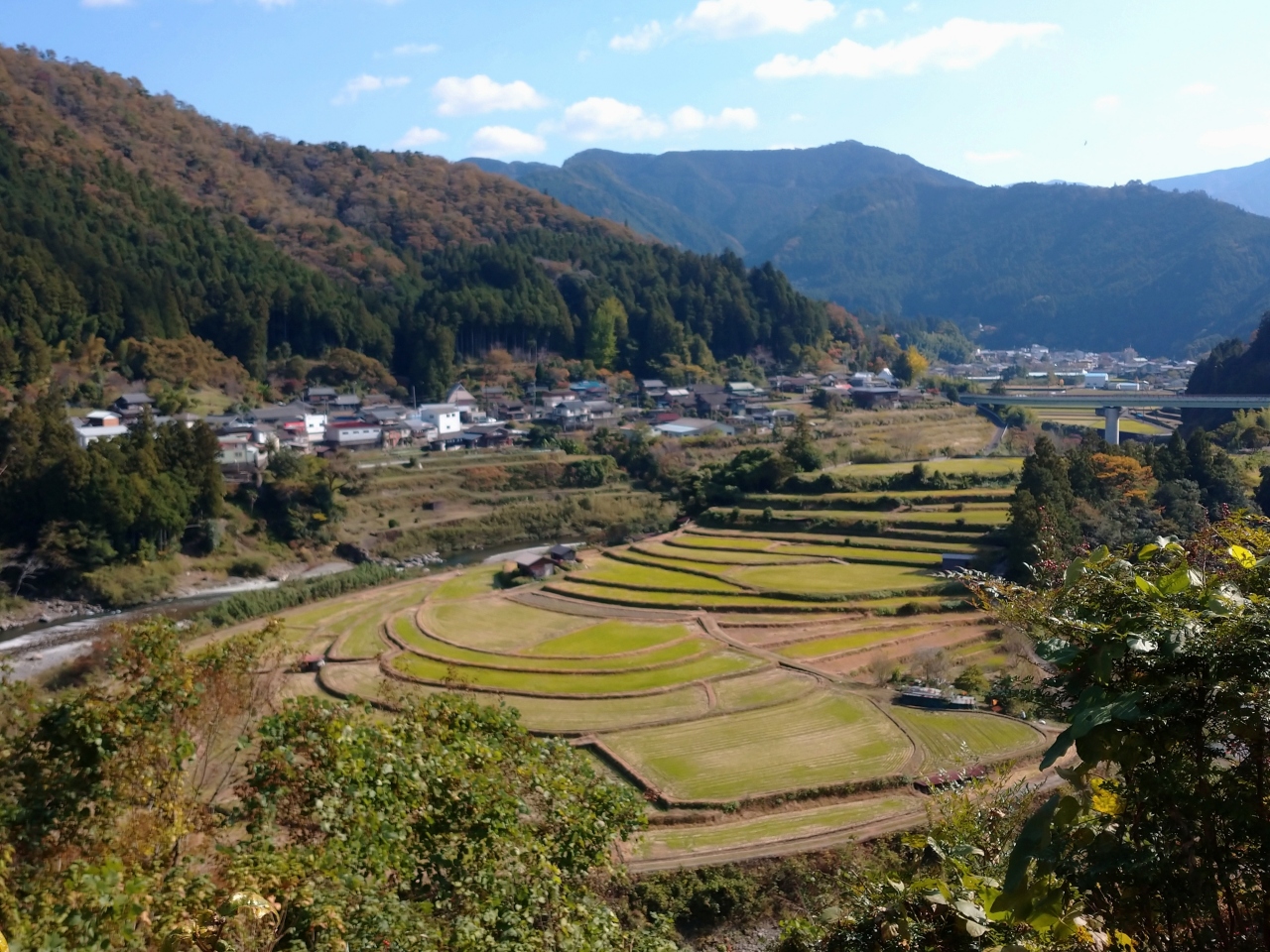 高野山から白浜町へ行く途中のルートにあります。小高い山から棚田を眺めますが、駐車場のスペースも展望所もさほど広くありません。11月ということで稲刈りは終了していましたが、若干緑がかっているのは麦でも植えているからでしょうか。観光パンフレットには四季折々の風景写真がのっており、雪景色もよさそうです。