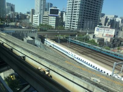 朝日を避けて進行方向右側を陣取りました。東京タワーから始まり東海道新幹線や天王洲アイルに大井競馬場を眺めながら羽田空港へ向かいます。